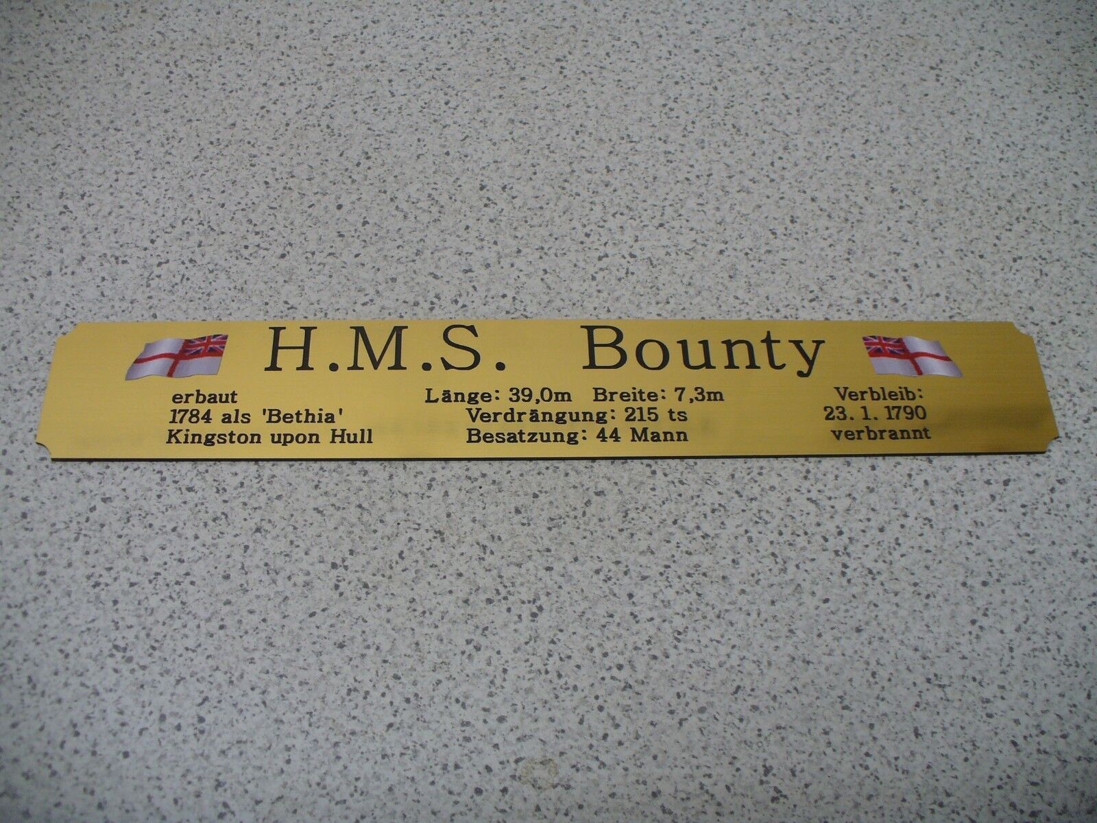 Sie bieten hier auf: 1 exclusives Namensschild mit Daten - Bounty - mit farbigen Flaggen und verschiedenen Daten (siehe Bild) goldfarbig mit schwarzem Schriftzug (auch in weiss - oder silberfarbig möglich --> dann bitte angeben) Abmessung: 275 x 43 x 1,5 mm Das Schild ist von mir mit einer CNC-Fr