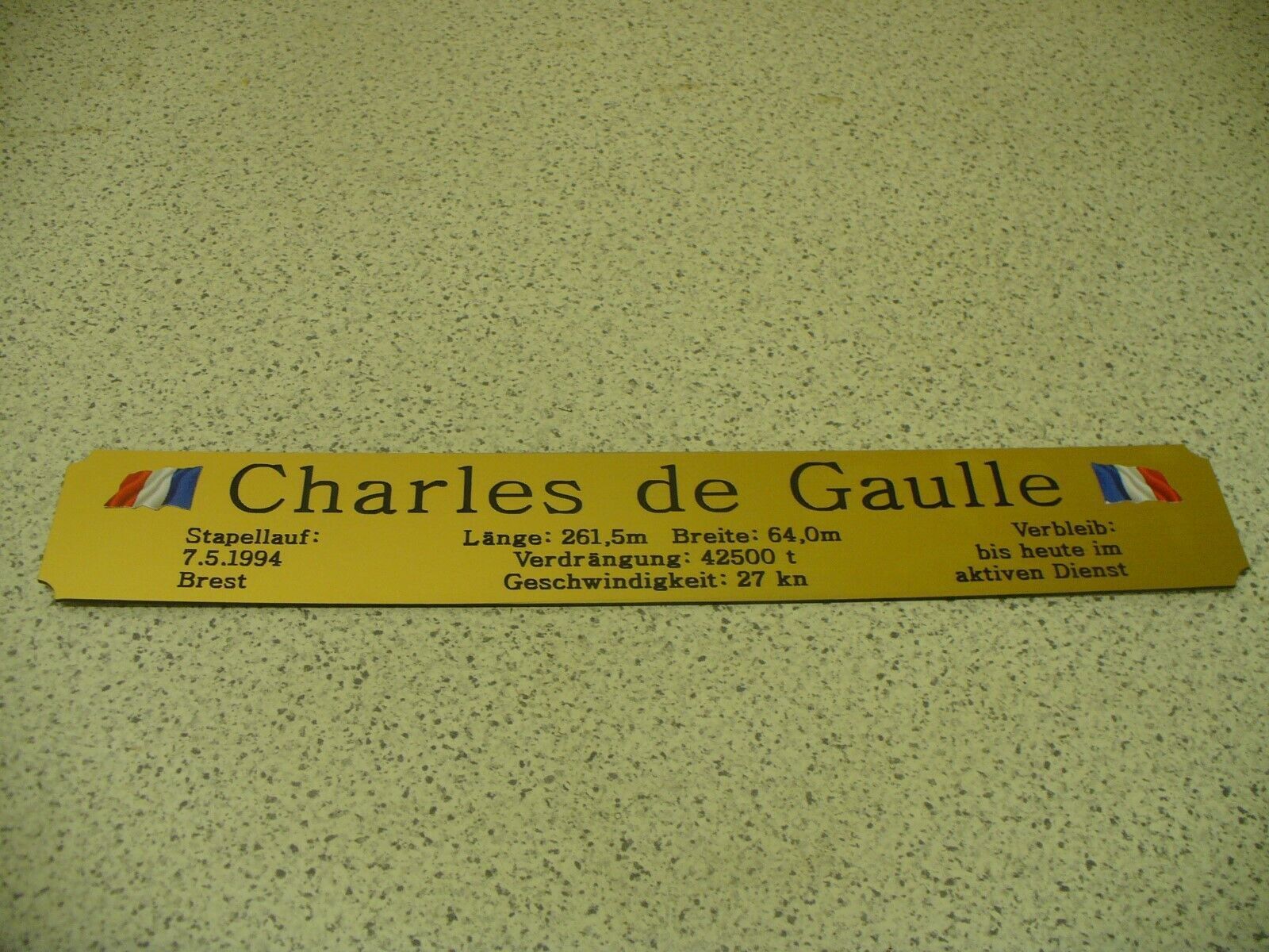Sie bieten hier auf: 1 exclusives Namensschild mit Daten - Charles de Gaulle - mit farbigen Logos und verschiedenen Daten (siehe Bild) goldfarbig mit schwarzem Schriftzug (auch in weiss - oder silberfarbig möglich --> dann bitte angeben) Abmessung: 275 x 43 x 1,5 mm Das Schild ist von mir mit ein
