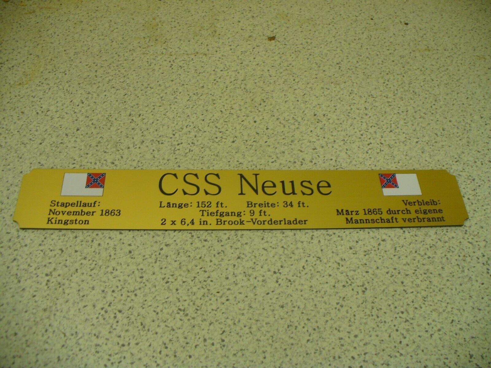 Sie bieten hier auf: 1 exclusives Namensschild mit Daten - CSS Neuse - mit farbigen Logos und verschiedenen Daten (siehe Bild) goldfarbig mit schwarzem Schriftzug (auch in weiss - oder silberfarbig möglich --> dann bitte angeben) Abmessung: 275 x 43 x 1,5 mm Das Schild ist von mir mit einer CNC-F