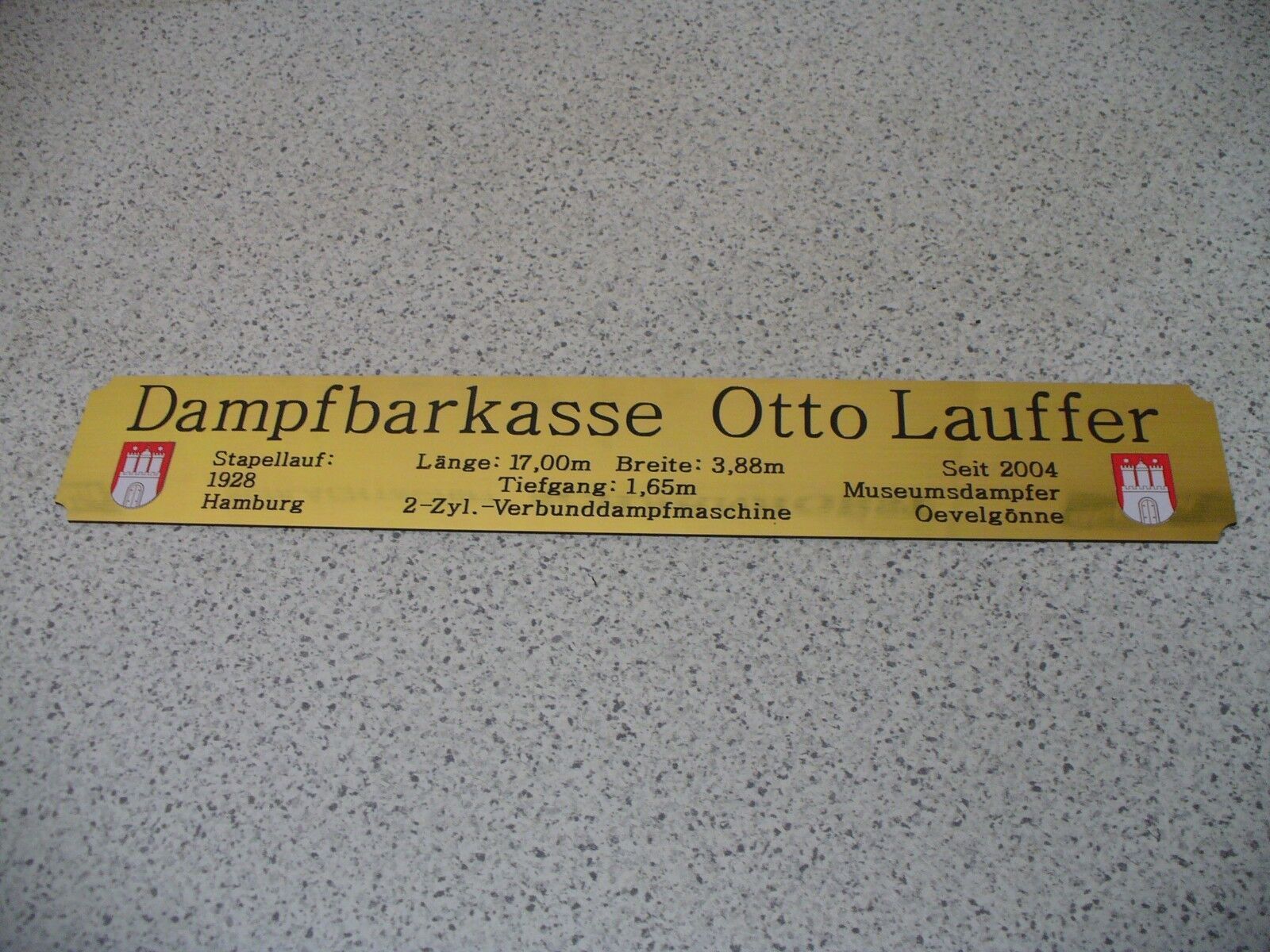 Sie bieten hier auf: 1 exclusives Namensschild mit Daten - Dampfbarkasse Otto Lauffer - mit farbigen Logos und verschiedenen Daten (siehe Bild) goldfarbig mit schwarzem Schriftzug (auch in weiss - oder silberfarbig möglich --> dann bitte angeben) Abmessung: 275 x 43 x 1,5 mm Das Schild ist von mi