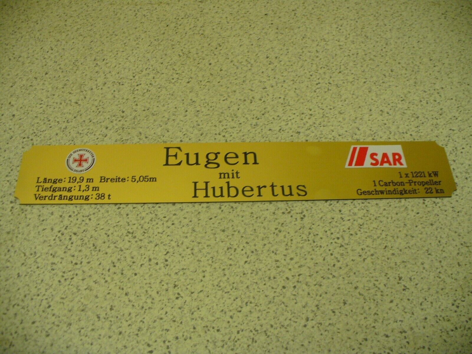 Sie bieten hier auf: 1 exclusives Namensschild mit Daten - Eugen mit Hubertus - mit farbigen Logos und verschiedenen Daten (siehe Bild) goldfarbig mit schwarzem Schriftzug (auch in weiss - oder silberfarbig möglich --> dann bitte angeben) Abmessung: 275 x 43 x 1,5 mm Das Schild ist von mir mit ei