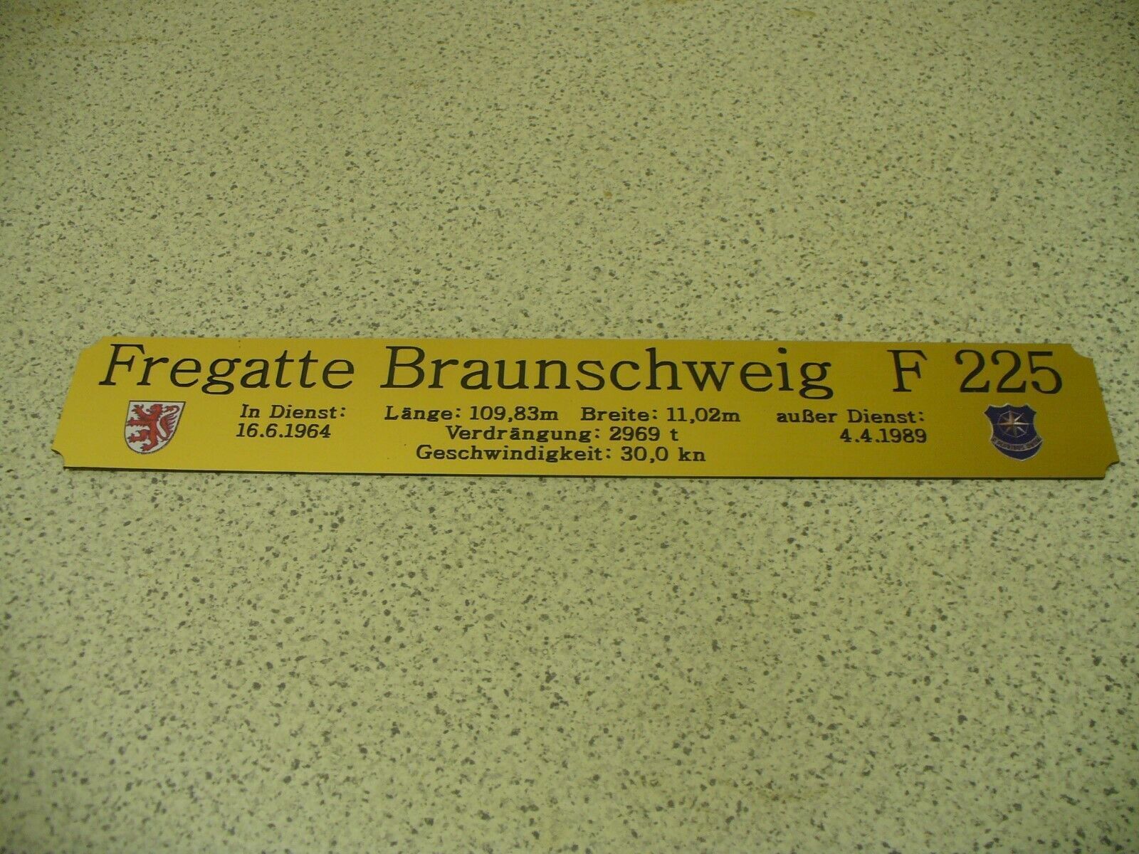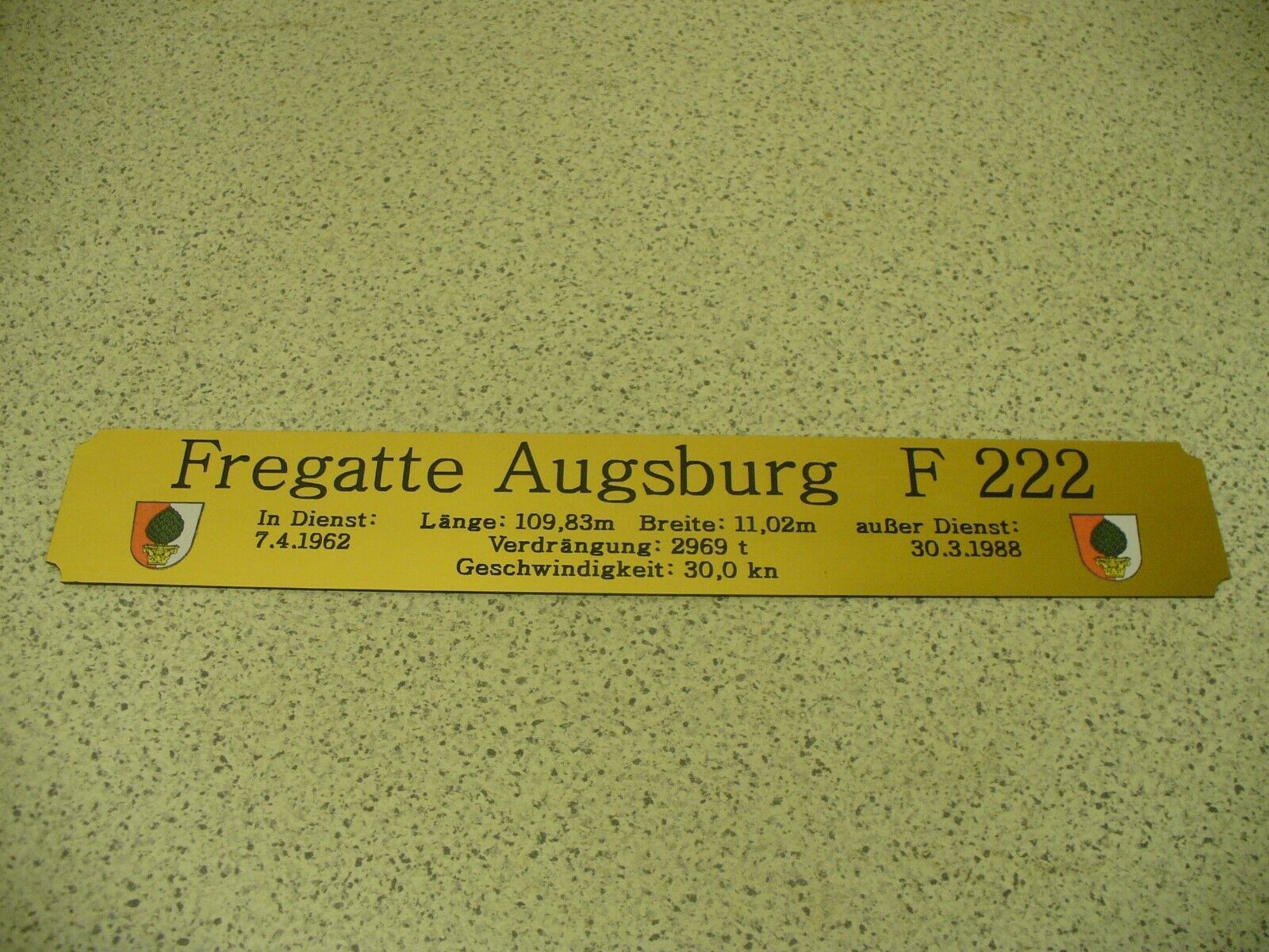 Sie bieten hier auf: 1 exclusives Namensschild mit Daten - Fregatte Augsburg F222 - mit farbigen Logos und verschiedenen Daten (siehe Bild) goldfarbig mit schwarzem Schriftzug (auch in weiss - oder silberfarbig möglich --> dann bitte angeben) Abmessung: 275 x 43 x 1,5 mm Das Schild ist von mir mi