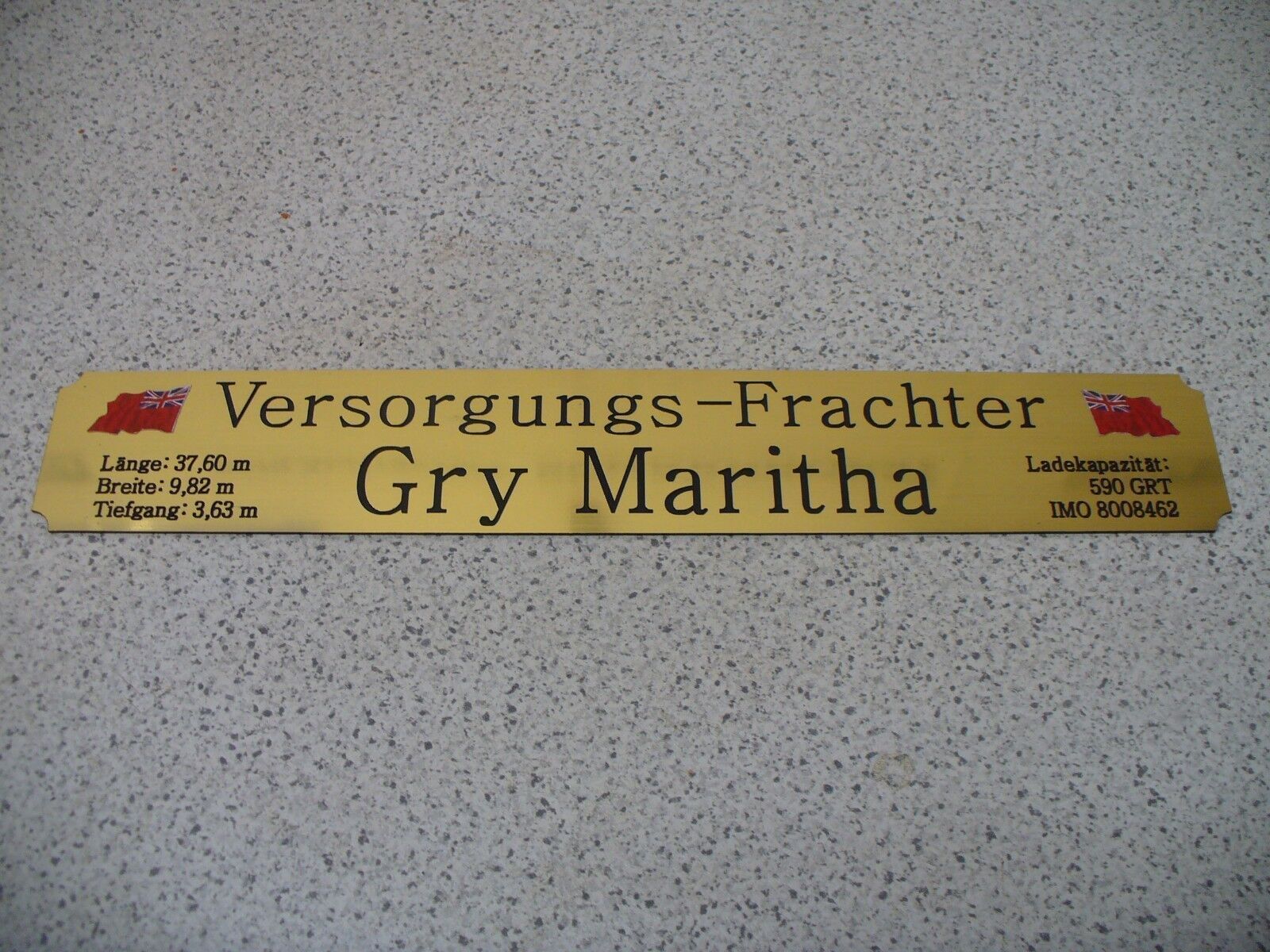 Sie bieten hier auf: 1 exclusives Namensschild mit Daten - Versorgungs-Frachter Gry Maritha - mit farbigen Logos und verschiedenen Daten (siehe Bild) goldfarbig mit schwarzem Schriftzug (auch in weiss - oder silberfarbig möglich --> dann bitte angeben) Abmessung: 275 x 43 x 1,5 mm Das Schild ist