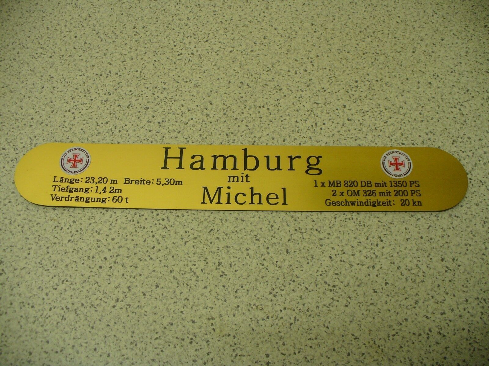 Sie bieten hier auf: 1 exclusives Namensschild mit Daten - Hamburg mit Michel - mit farbigen Logos und verschiedenen Daten (siehe Bild) goldfarbig mit schwarzem Schriftzug (auch in weiss - oder silberfarbig möglich --> dann bitte angeben) Abmessung: 275 x 43 x 1,5 mm Das Schild ist von mir mit ei