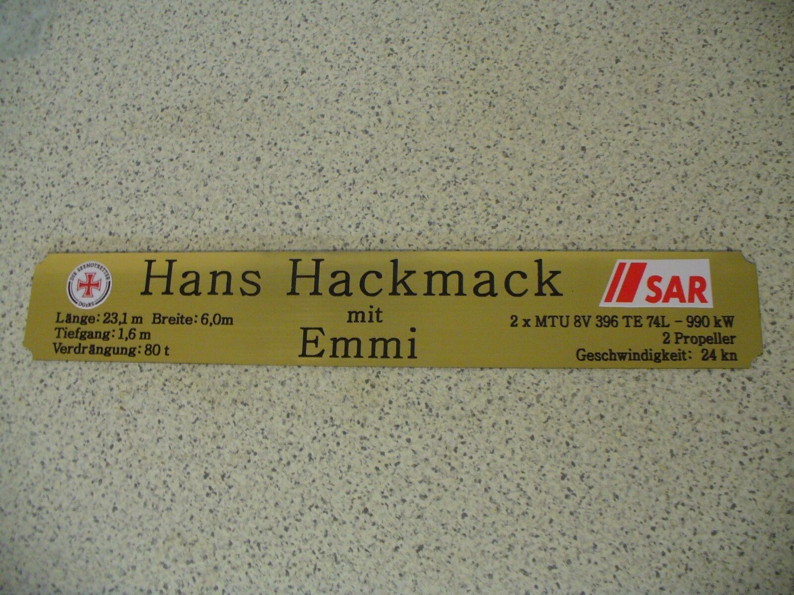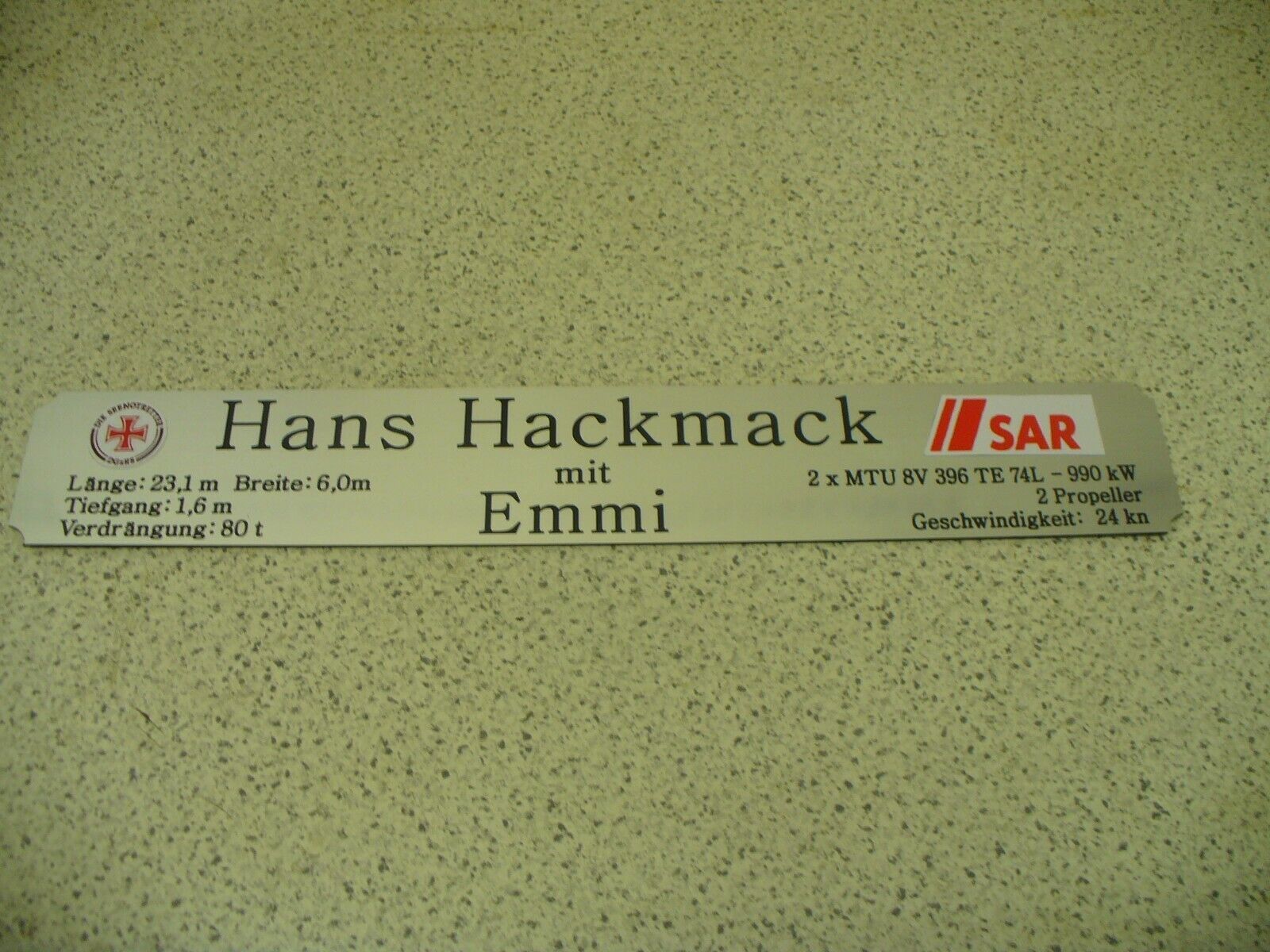 Sie bieten hier auf: 1 exclusives Namensschild mit Daten - Hans Hackmack mit Emmi - mit farbigen Logos und verschiedenen Daten (siehe Bild) goldfarbig mit schwarzem Schriftzug (auch in weiss - oder silberfarbig möglich --> dann bitte angeben) Abmessung: 275 x 43 x 1,5 mm Das Schild ist von mir mi