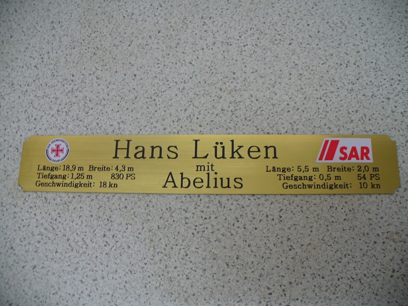Sie bieten hier auf: 1 exclusives Namensschild mit Daten - Hans Lüken - mit farbigen Logos und verschiedenen Daten (siehe Bild) goldfarbig mit schwarzem Schriftzug (auch in weiss - oder silberfarbig möglich --> dann bitte angeben) Abmessung: 275 x 43 x 1,5 mm Das Schild ist von mir mit einer CNC-