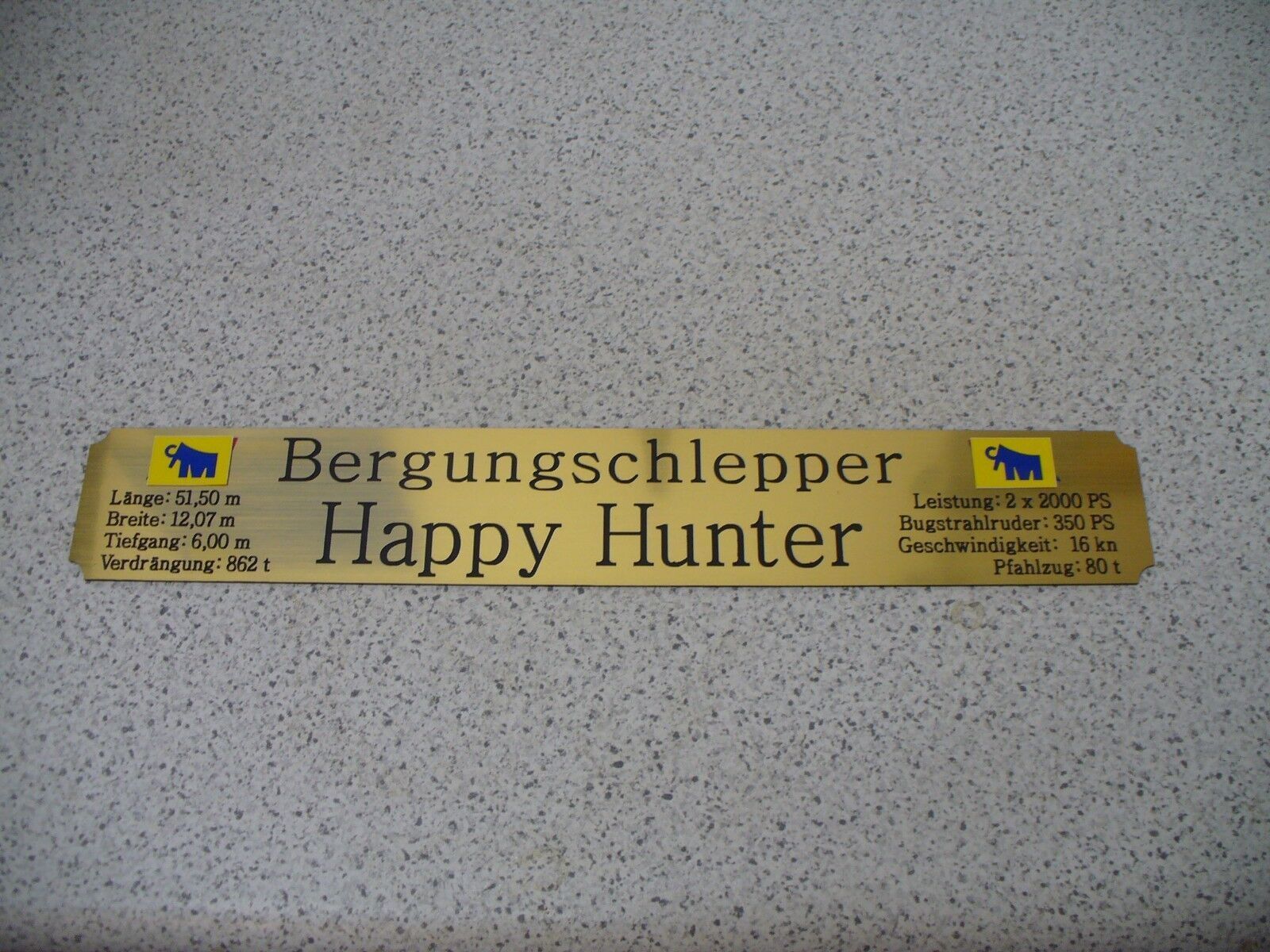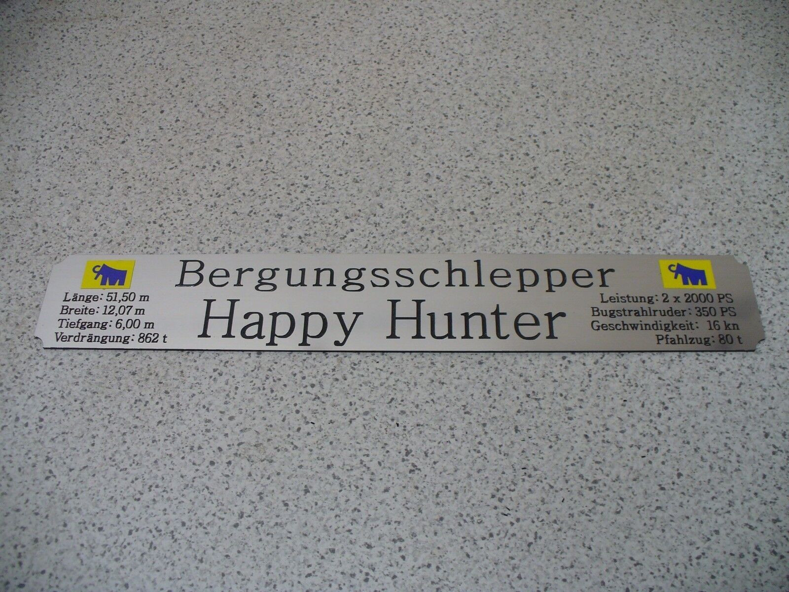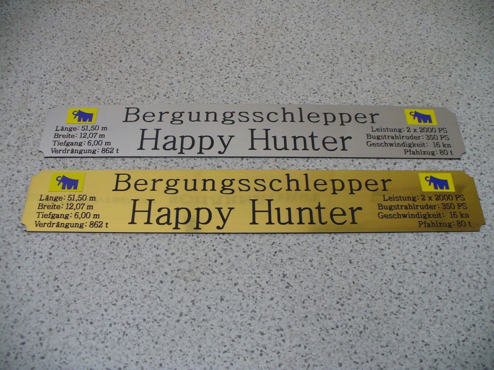 Sie bieten hier auf: 1 exclusives Namensschild mit Daten - Happy Hunter - mit farbigen Logos und verschiedenen Daten (siehe Bild) goldfarbig mit schwarzem Schriftzug (auch in weiss - oder silberfarbig möglich --> dann bitte angeben) Abmessung: 275 x 43 x 1,5 mm Das Schild ist von mir mit einer CN