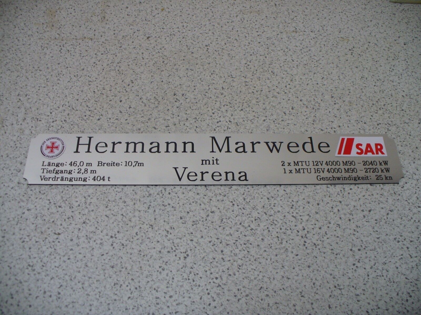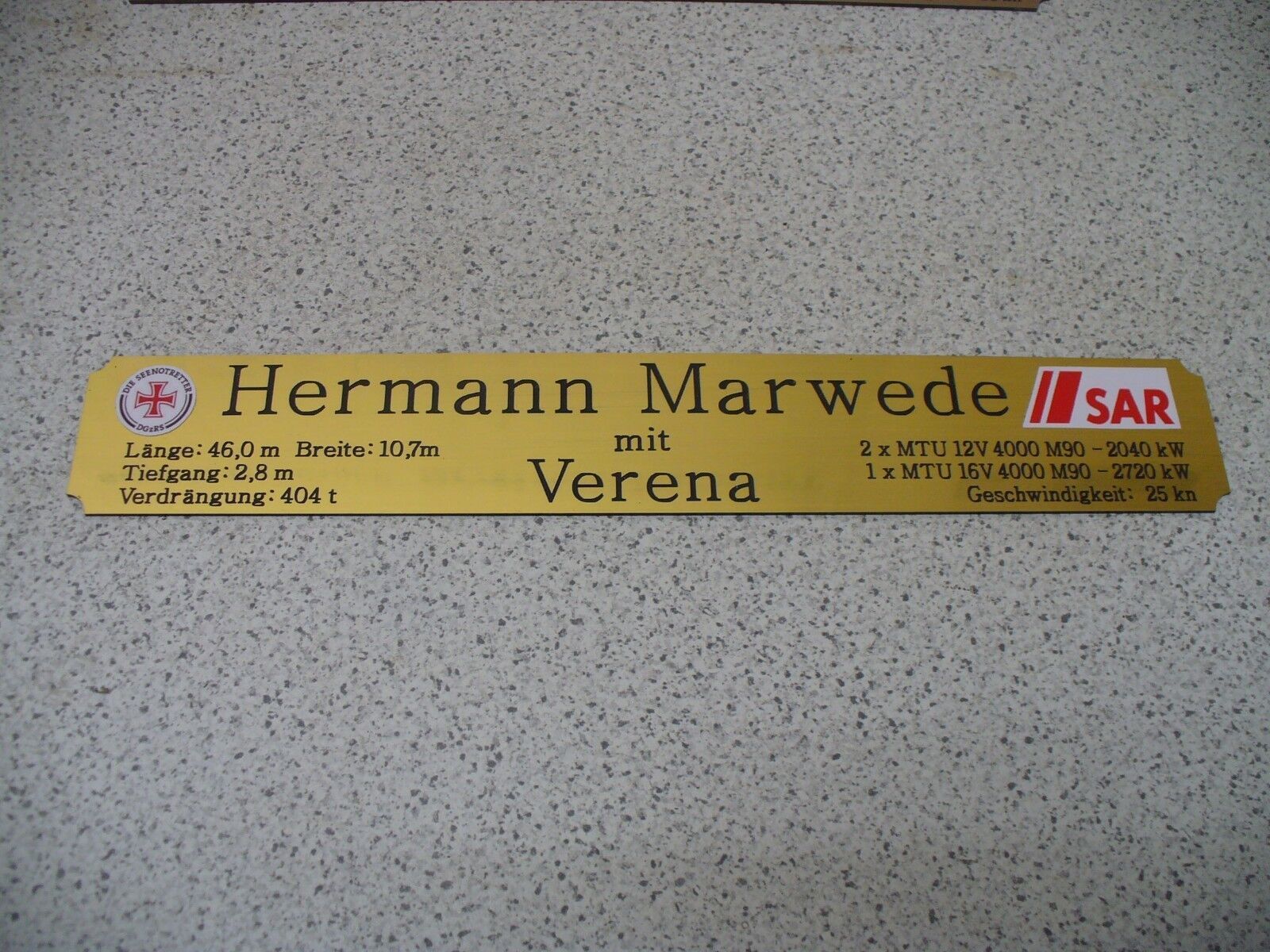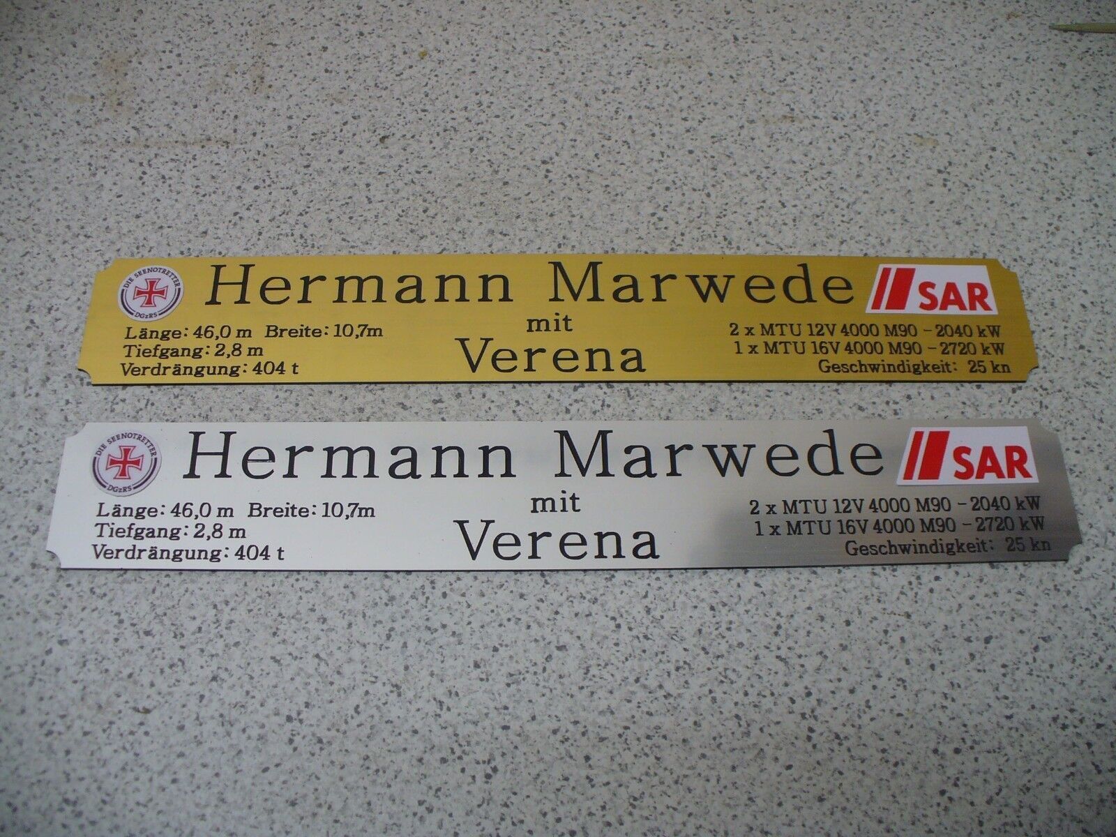 Sie bieten hier auf: 1 exclusives Namensschild mit Daten - Hermann Marwede - mit farbigen Logos und verschiedenen Daten (siehe Bild) goldfarbig mit schwarzem Schriftzug (auch in weiss - oder silberfarbig möglich --> dann bitte angeben) Abmessung: 275 x 43 x 1,5 mm Das Schild ist von mir mit einer
