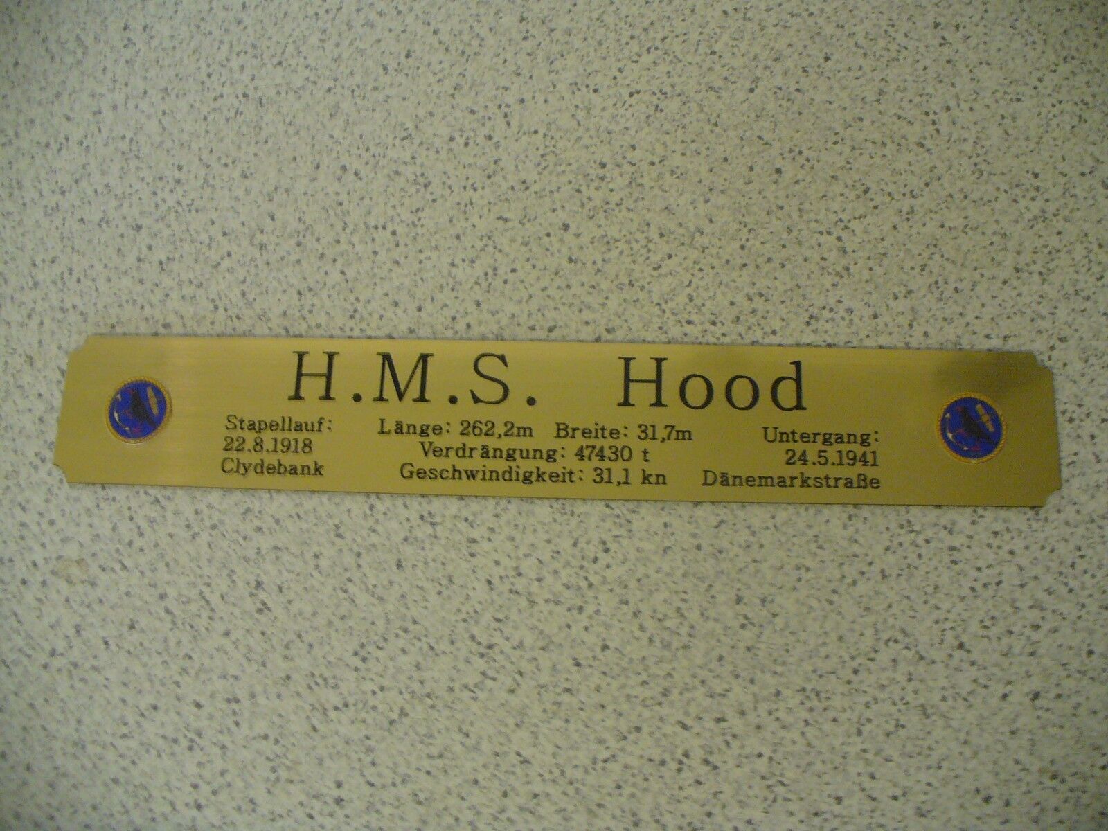 Sie bieten hier auf: 1 exclusives Namensschild mit Daten - HMS Hood - mit farbigen Logos und verschiedenen Daten (siehe Bild) goldfarbig mit schwarzem Schriftzug (auch in weiss - oder silberfarbig möglich --> dann bitte angeben) Abmessung: 275 x 43 x 1,5 mm Das Schild ist von mir mit einer CNC-Fr