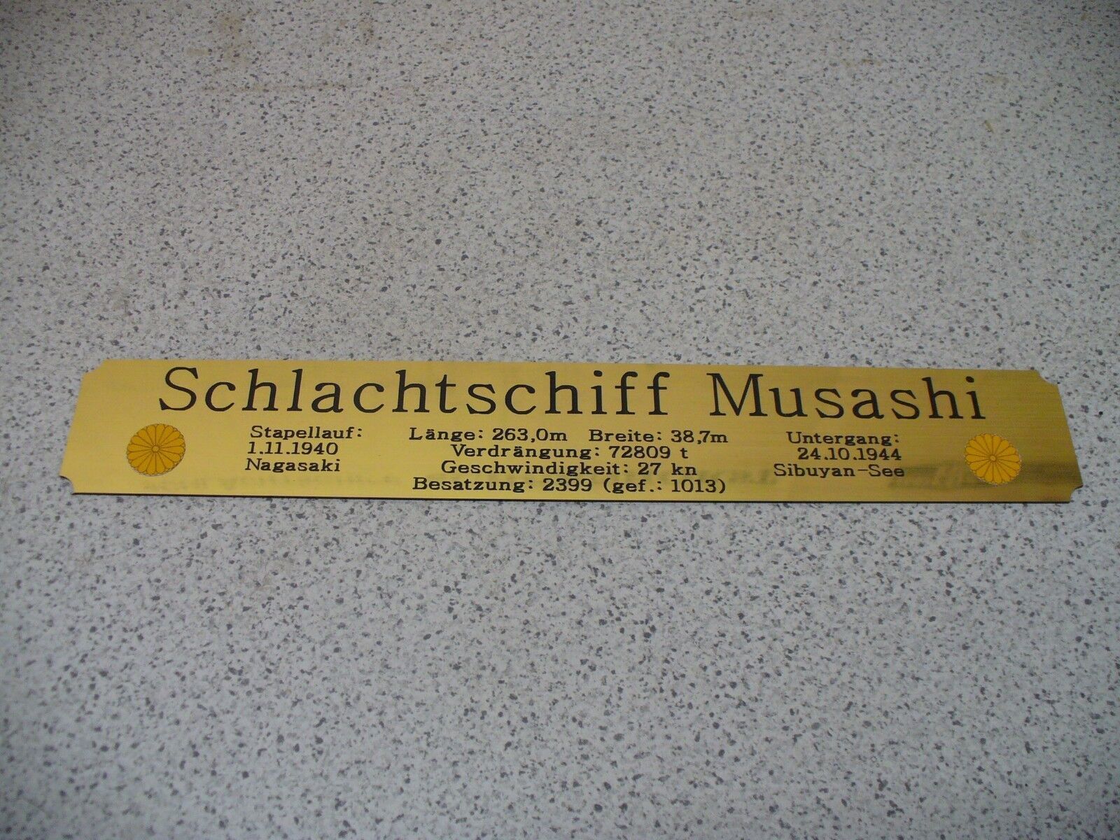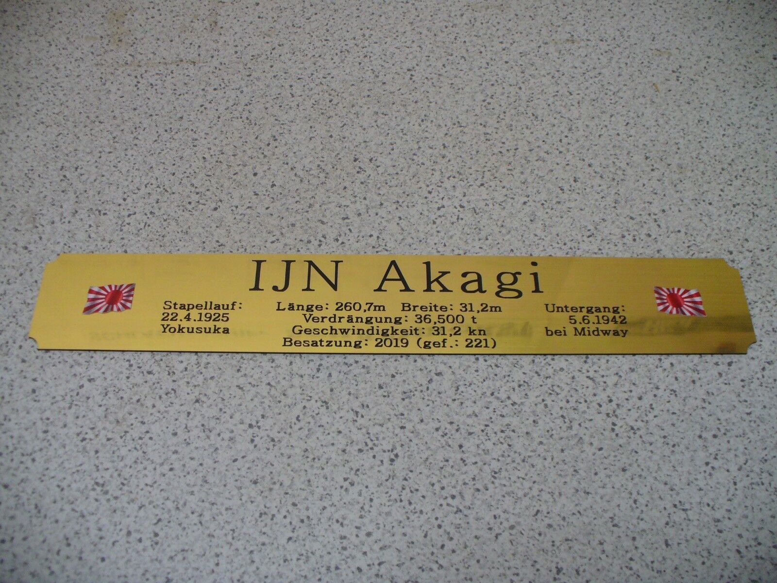 Sie bieten hier auf: 1 exclusives Namensschild mit Daten - IJN Akagi - mit farbigen Logos und verschiedenen Daten (siehe Bild) goldfarbig mit schwarzem Schriftzug (auch in weiss - oder silberfarbig möglich --> dann bitte angeben) Abmessung: 275 x 43 x 1,5 mm Das Schild ist von mir mit einer CNC-F