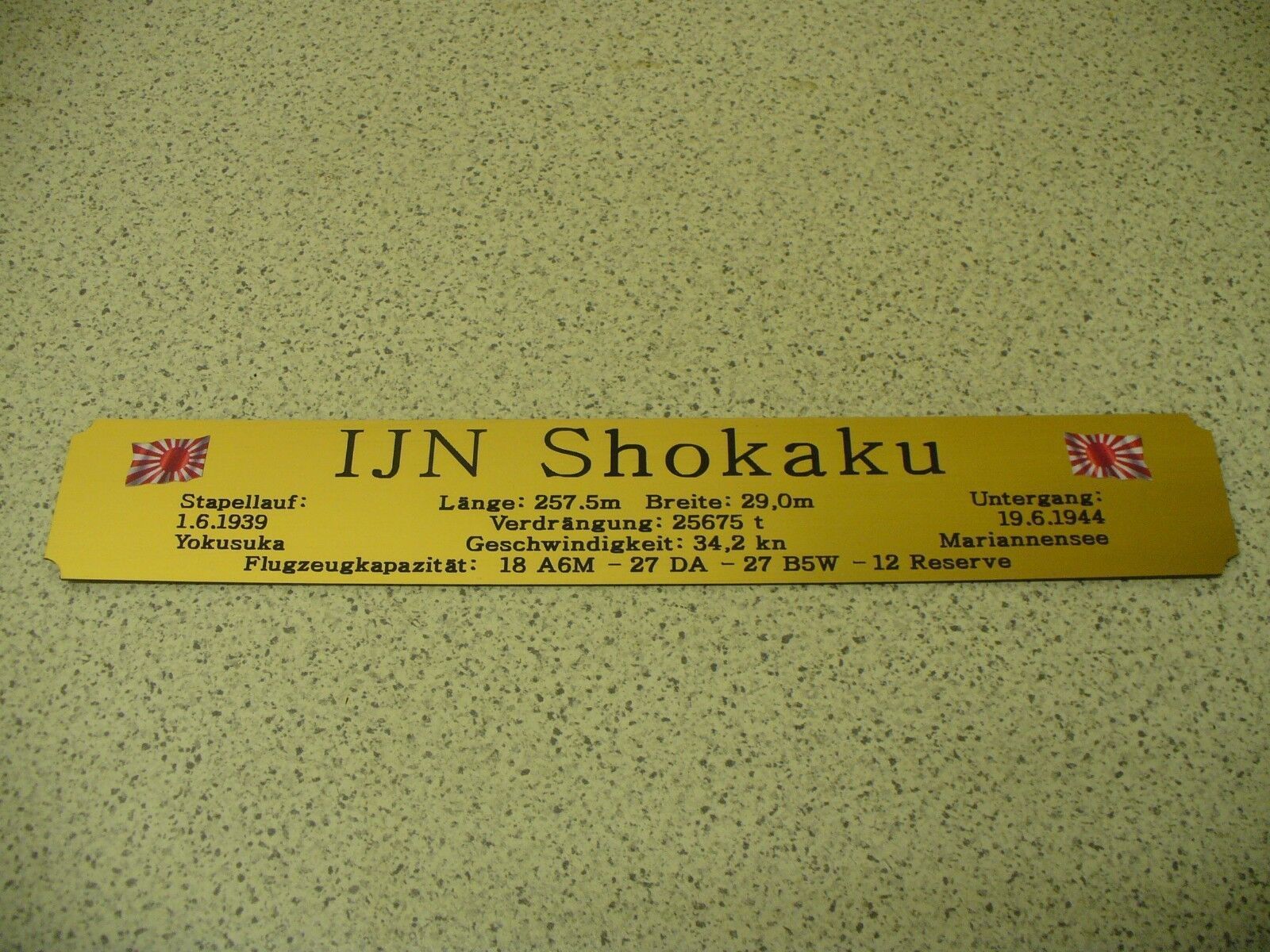 Sie bieten hier auf: 1 exclusives Namensschild mit Daten - IJN Shokaku - mit farbigen Logos und verschiedenen Daten (siehe Bild) goldfarbig mit schwarzem Schriftzug (auch in weiss - oder silberfarbig möglich --> dann bitte angeben) Abmessung: 275 x 43 x 1,5 mm Das Schild ist von mir mit einer CNC