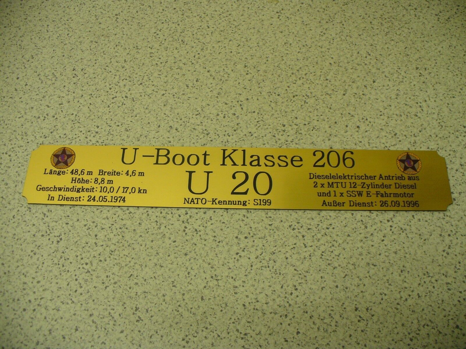 Sie bieten hier auf: 1 exclusives Namensschild mit Daten - Klasse 206 U 20 - mit farbigen Logos und verschiedenen Daten (siehe Bild) goldfarbig mit schwarzem Schriftzug (auch in weiss - oder silberfarbig möglich --> dann bitte angeben) Abmessung: 275 x 43 x 1,5 mm Das Schild ist von mir mit einer