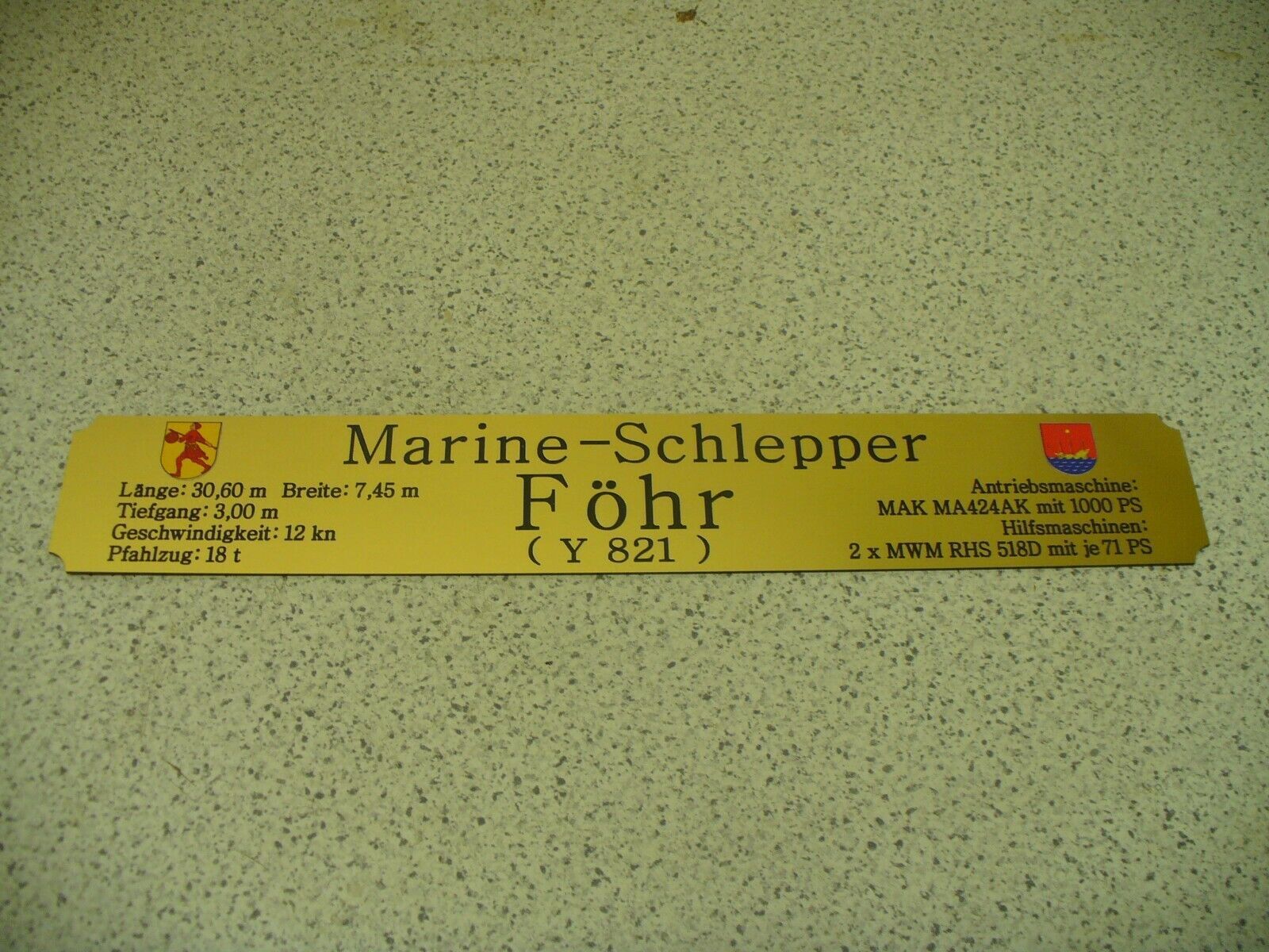 Sie bieten hier auf: 1 exclusives Namensschild mit Daten - Marine-Schlepper Föhr (Y821) - mit farbigen Logos und verschiedenen Daten (siehe Bild) goldfarbig mit schwarzem Schriftzug (auch in weiss - oder silberfarbig möglich --> dann bitte angeben) Abmessung: 275 x 43 x 1,5 mm Das Schild ist von