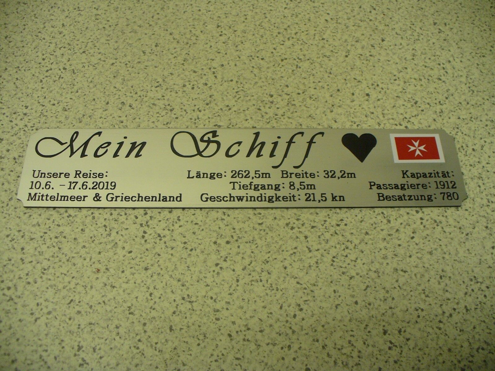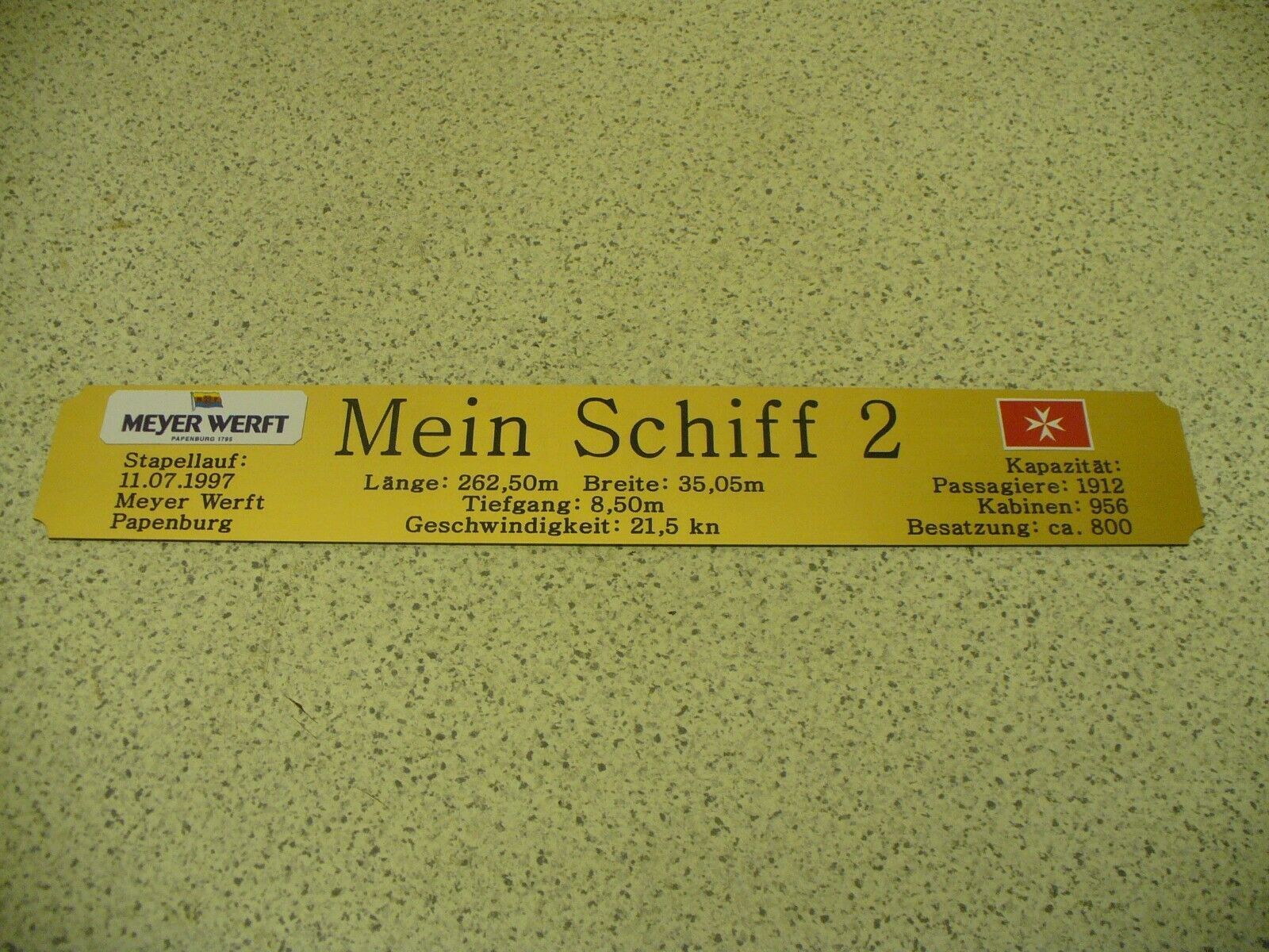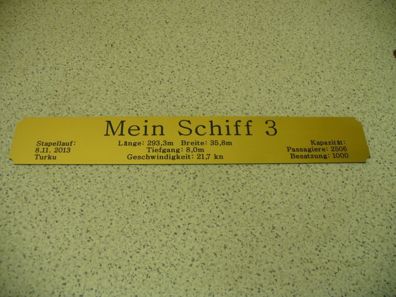 Sie bieten hier auf: 1 exclusives Namensschild mit Daten - Mein Schiff 2 - ( auf Wunsch auch als 'Mein Schiff 3' oder 'Mein Schiff Herz' - dann bitte angeben ) mit verschiedenen Daten (siehe Bild) goldfarbig mit schwarzem Schriftzug (auch in weiss - oder silberfarbig möglich --> dann bitte angebe