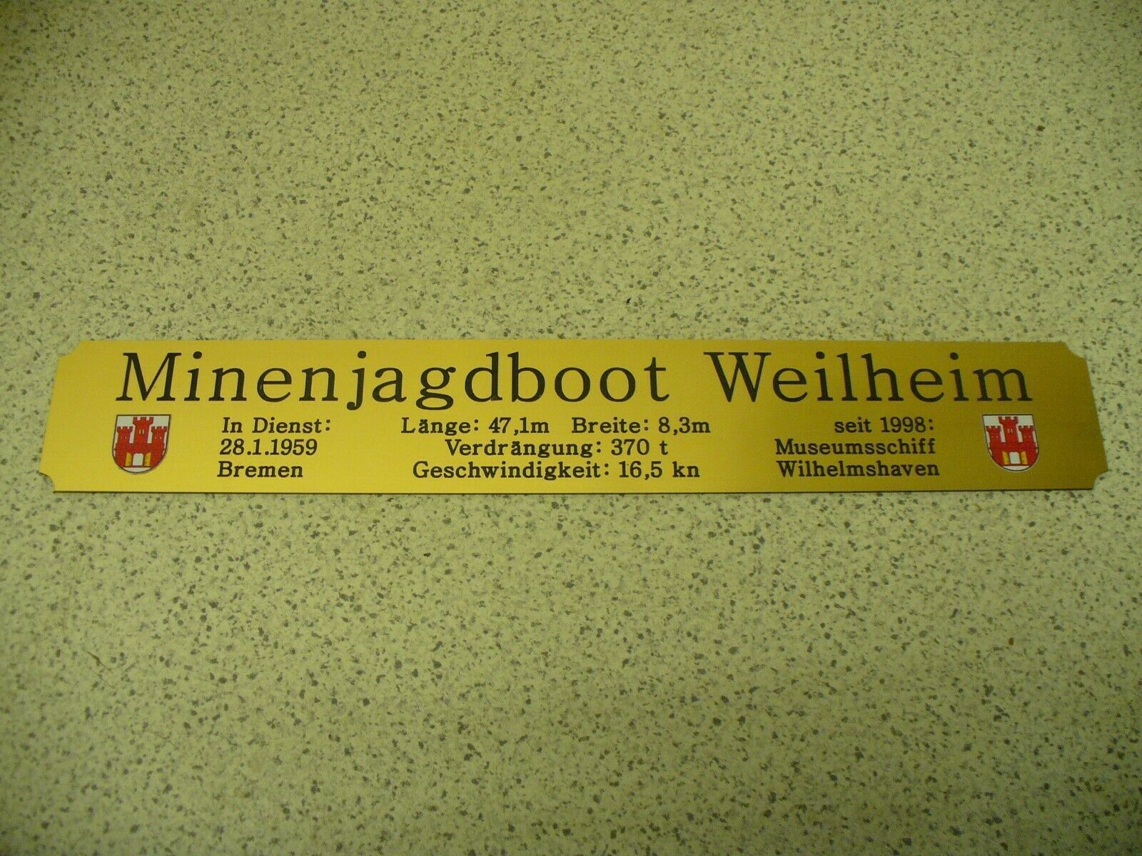Sie bieten hier auf: 1 exclusives Namensschild mit Daten - Minenjagdboot Weilheim - mit farbigen Logos und verschiedenen Daten (siehe Bild) goldfarbig mit schwarzem Schriftzug (auch in weiss - oder silberfarbig möglich --> dann bitte angeben) Abmessung: 275 x 43 x 1,5 mm Das Schild ist von mir mi