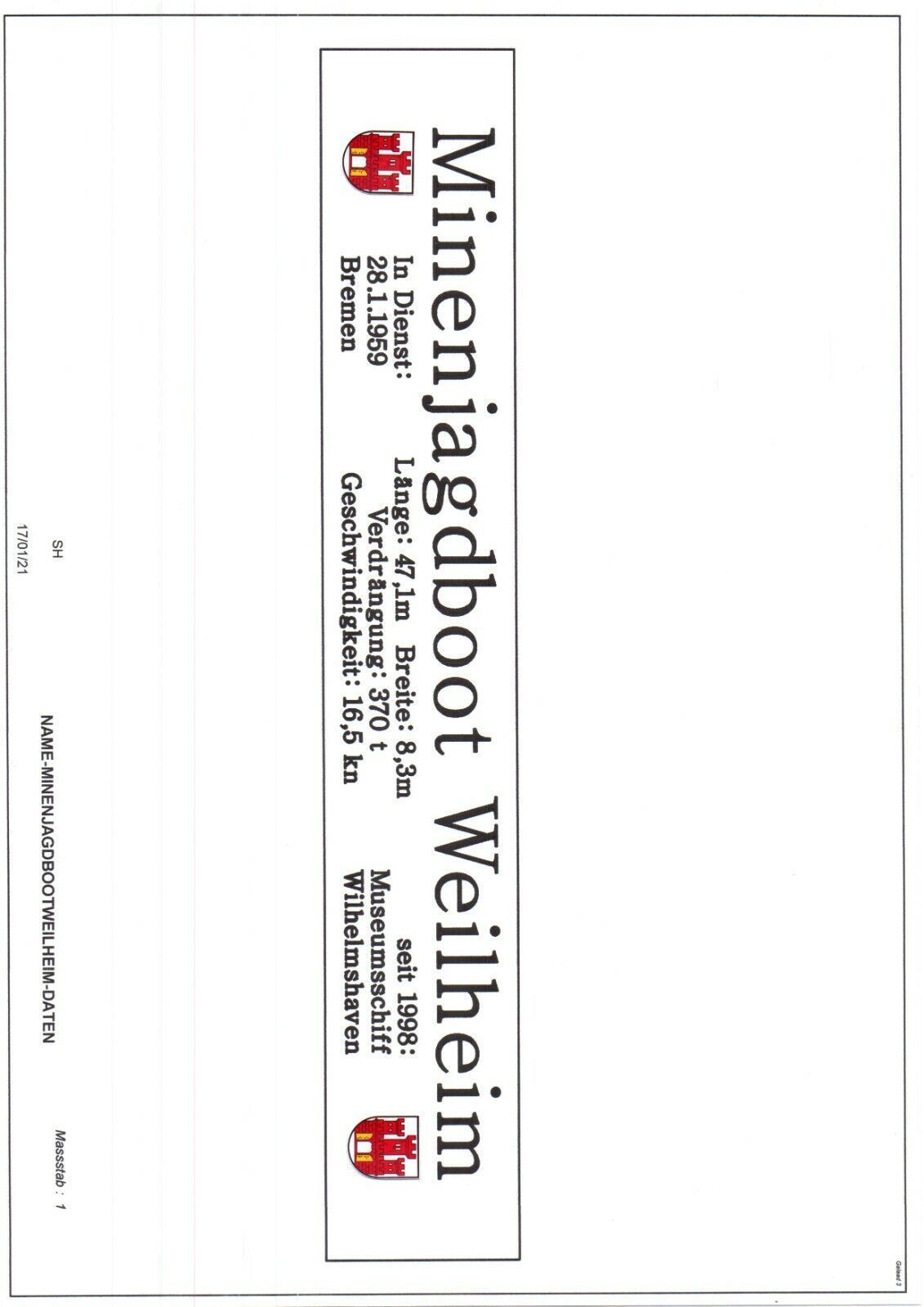Namensschild für Modellständer mit Daten - Minenjagdboot Weilheim