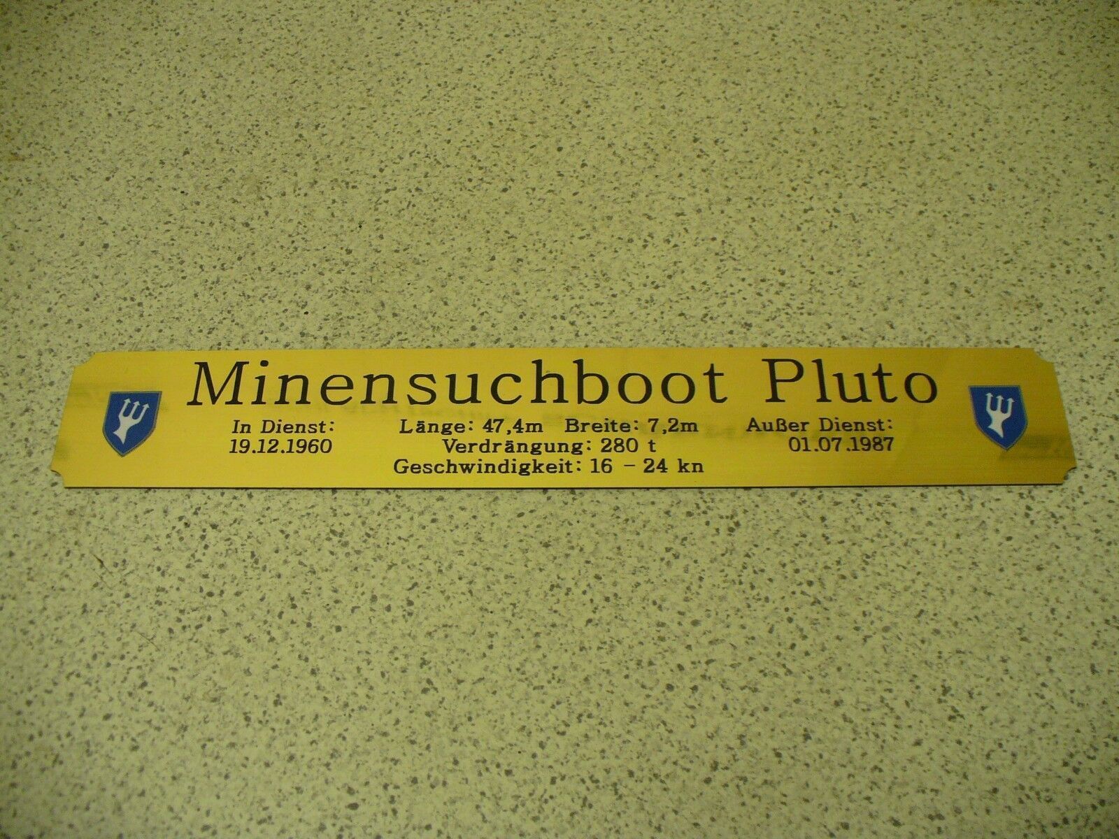 Sie bieten hier auf: 1 exclusives Namensschild mit Daten - Minensuchboot Pluto - mit farbigen Logos und verschiedenen Daten (siehe Bild) goldfarbig mit schwarzem Schriftzug (auch in weiss - oder silberfarbig möglich --> dann bitte angeben) Abmessung: 275 x 43 x 1,5 mm Das Schild ist von mir mit e