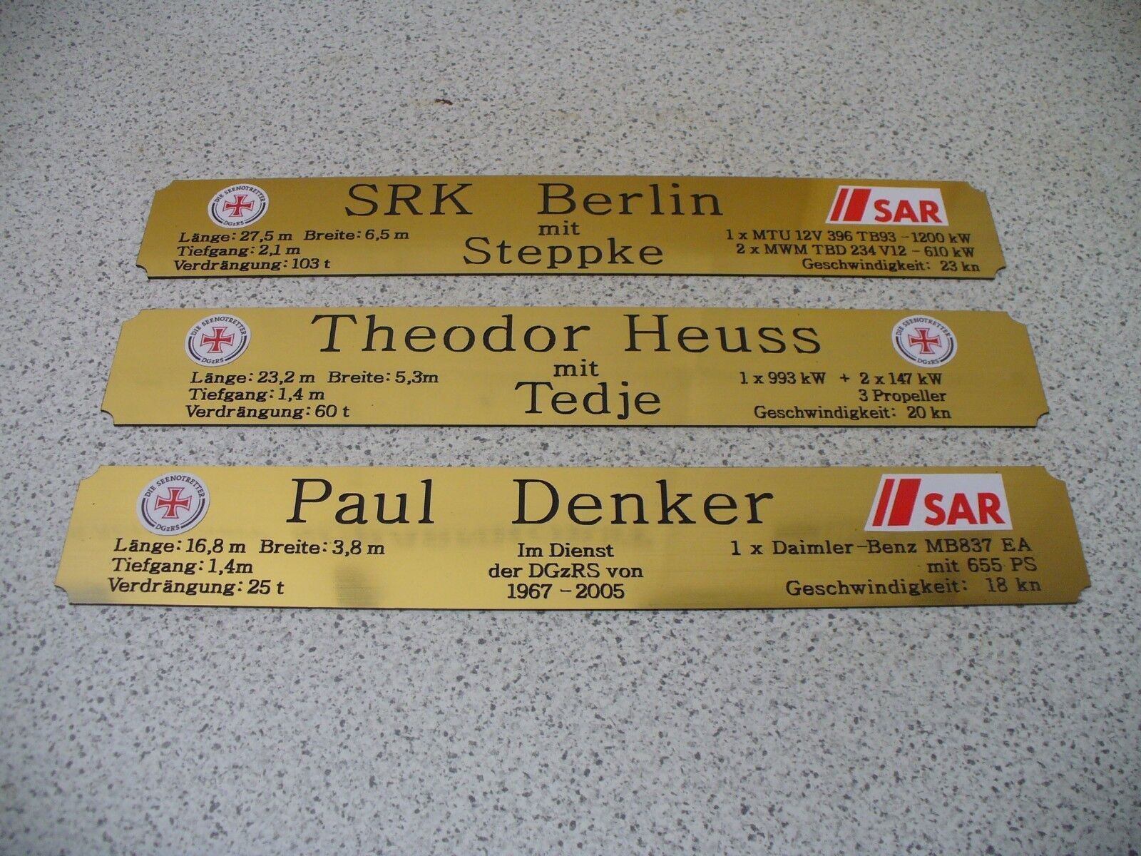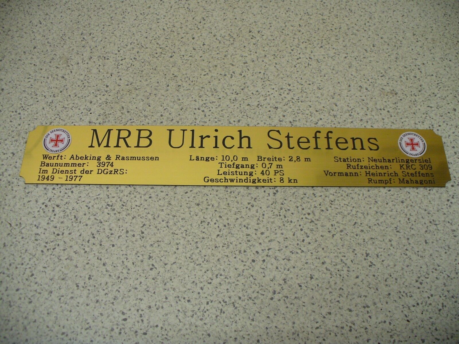 Sie bieten hier auf: 1 exclusives Namensschild mit Daten - MRB Ulrich Steffens - mit farbigen Logos und verschiedenen Daten (siehe Bild) goldfarbig mit schwarzem Schriftzug (auch in weiss - oder silberfarbig möglich --> dann bitte angeben) Abmessung: 275 x 43 x 1,5 mm Das Schild ist von mir mit e