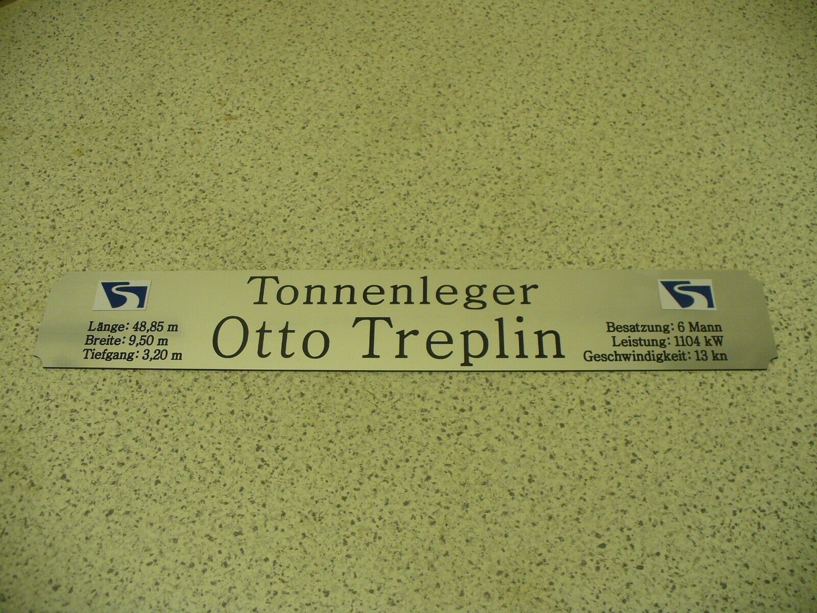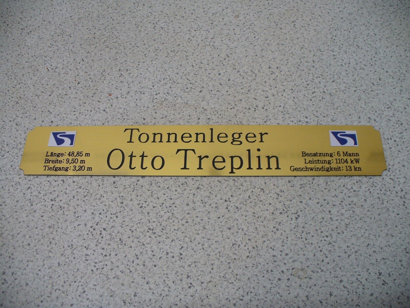 Sie bieten hier auf: 1 exclusives Namensschild mit Daten - Otto Treplin - mit farbigen Logos und verschiedenen Daten (siehe Bild) goldfarbig mit schwarzem Schriftzug (auch in weiss - oder silberfarbig möglich --> dann bitte angeben) Abmessung: 275 x 43 x 1,5 mm Das Schild ist von mir mit einer CN