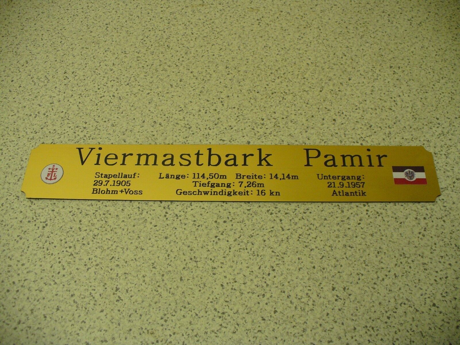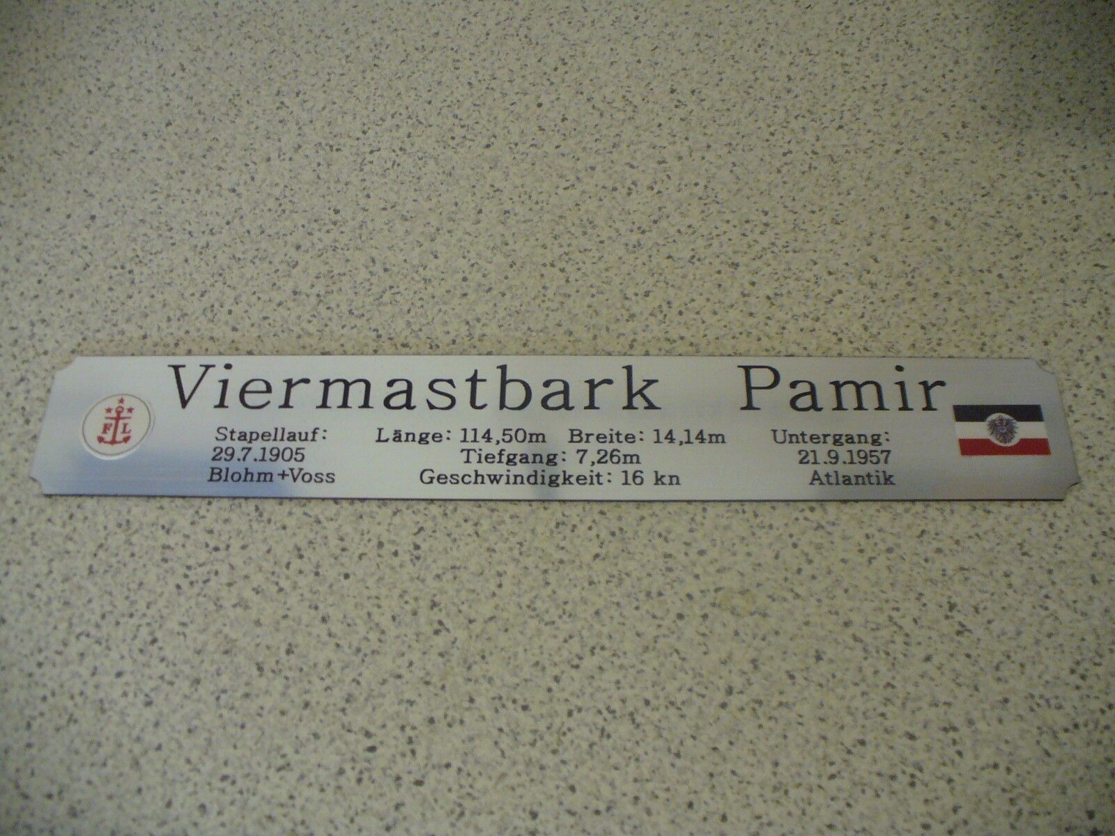 Sie bieten hier auf: 1 exclusives Namensschild mit Daten - Viermastbark Pamir - mit farbigen Logos und verschiedenen Daten (siehe Bild) silberfarbig mit schwarzem Schriftzug (auch in weiss - oder goldfarbig möglich --> dann bitte angeben) Abmessung: 275 x 43 x 1,5 mm Das Schild ist von mir mit ei