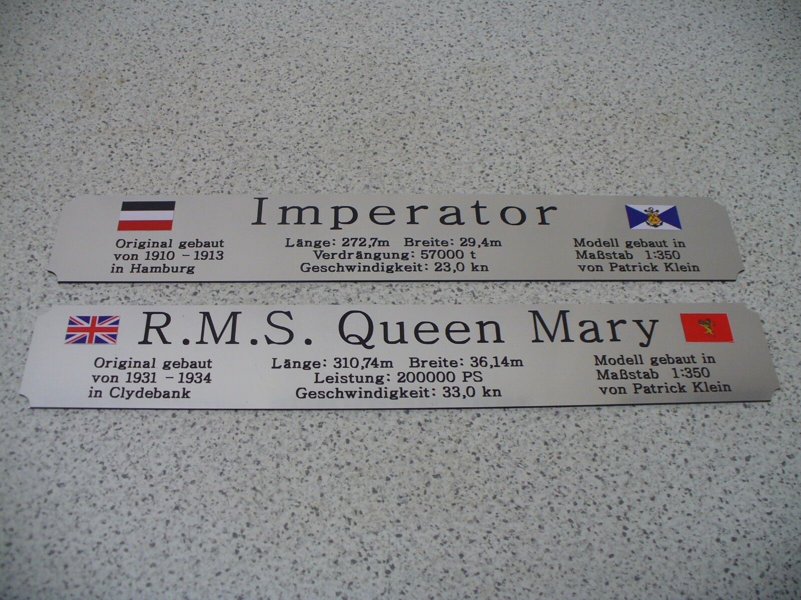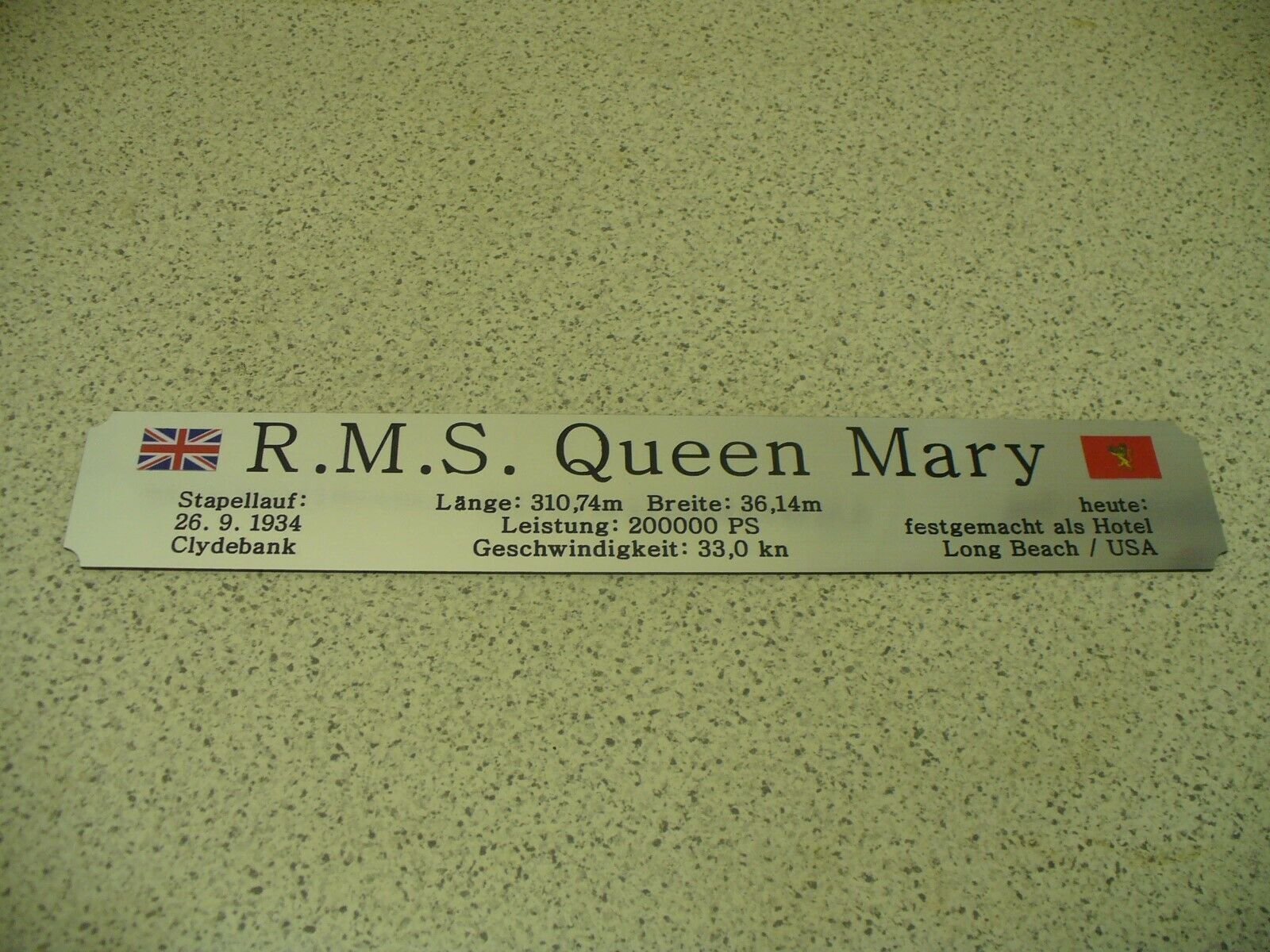Sie bieten hier auf: 1 exclusives Namensschild mit Daten - Queen Mary - mit farbigen Logos und verschiedenen Daten (siehe Bild) silberfarbig mit schwarzem Schriftzug (auch in weiss - oder goldfarbig möglich --> dann bitte angeben) Abmessung: 275 x 43 x 1,5 mm Das Schild ist von mir mit einer CNC-