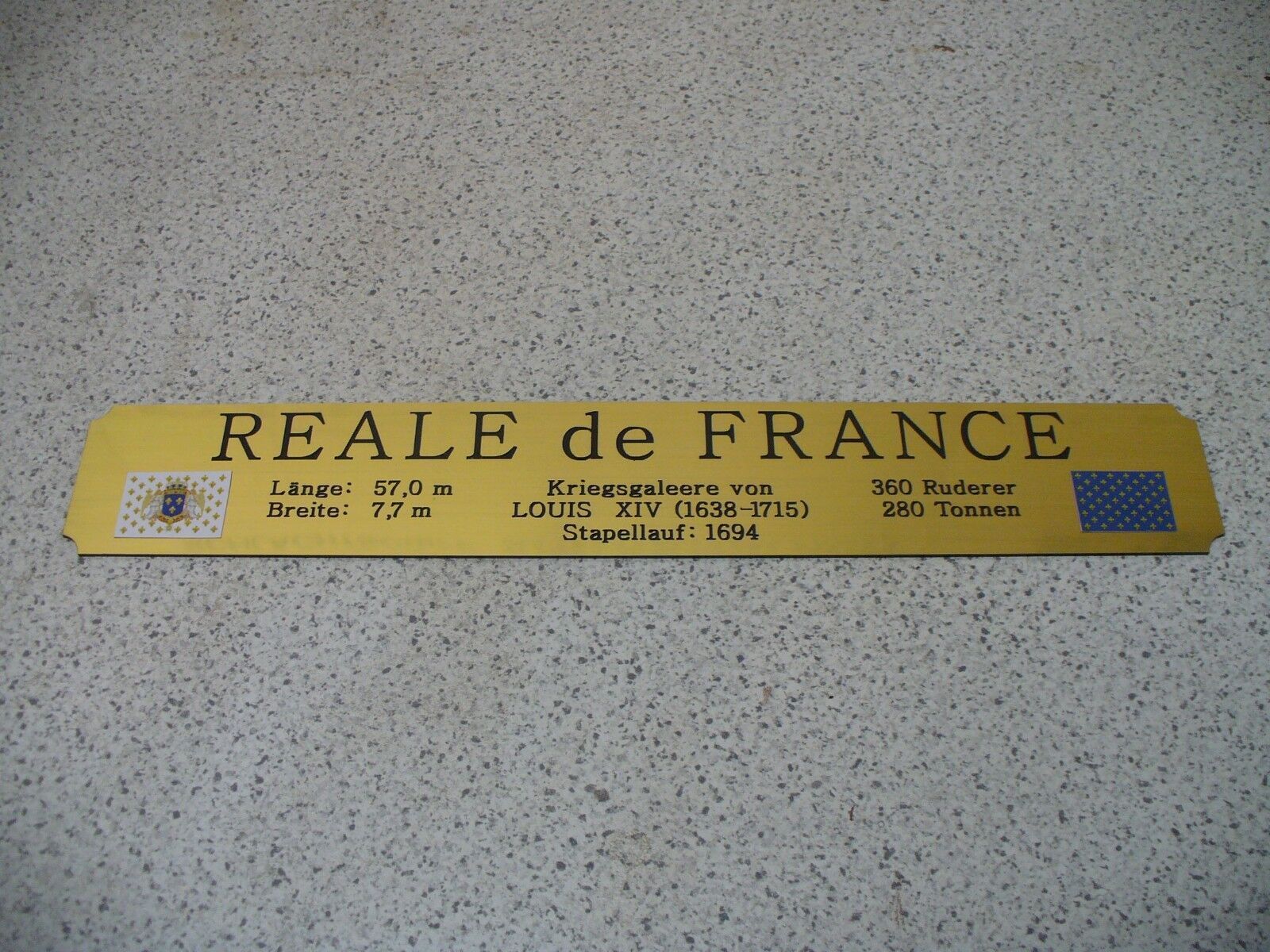 Sie bieten hier auf: 1 exclusives Namensschild mit Daten - Reale de France - mit farbigen Flaggen und verschiedenen Daten (siehe Bild) - auf Wunsch auch als 'La Reale de Frace' dann bitte angeben - goldfarbig mit schwarzem Schriftzug (auch in weiss - oder silberfarbig möglich --> dann bitte angeb