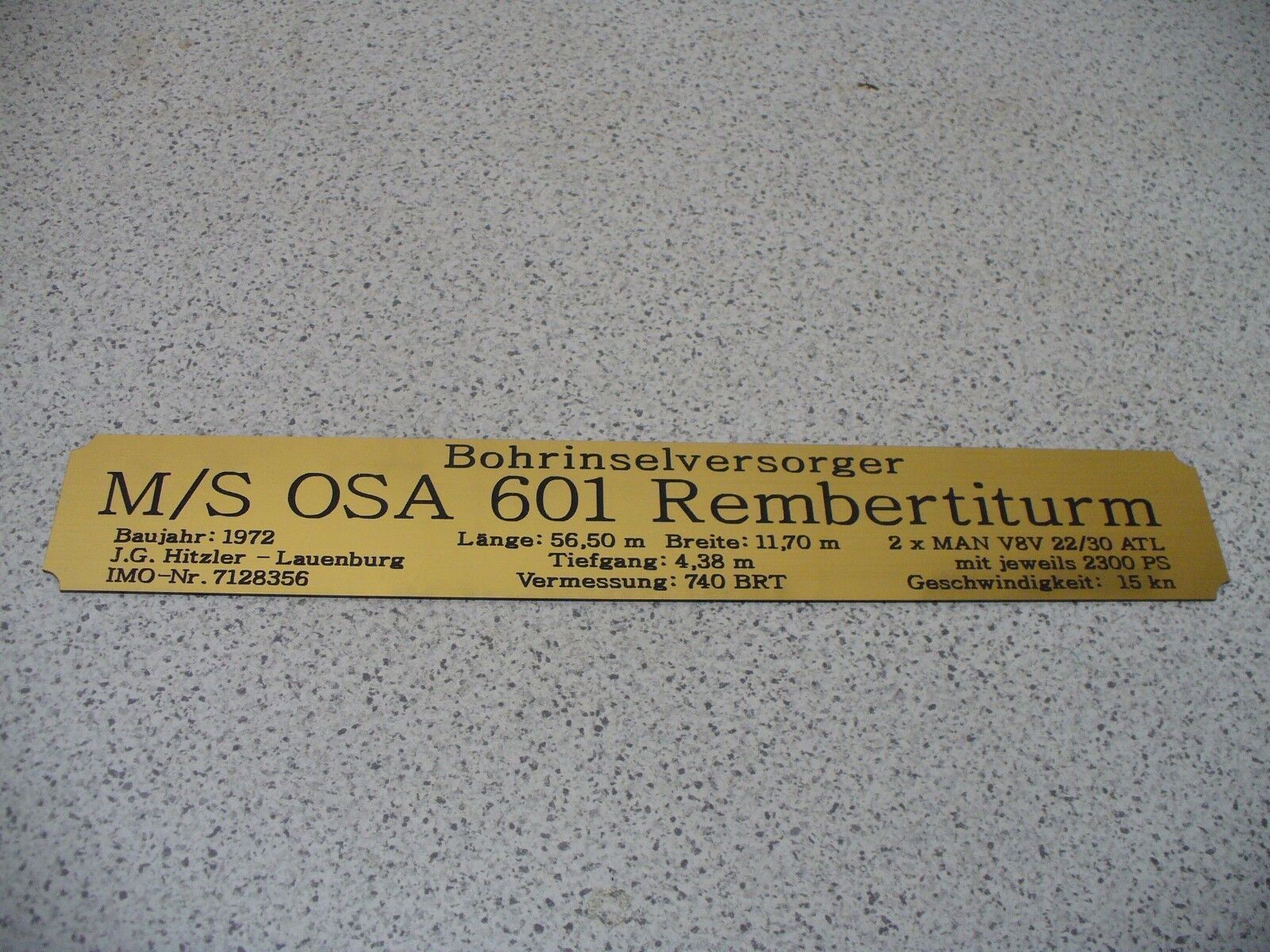 Sie bieten hier auf: 1 exclusives Namensschild mit Daten - Rembertiturm - mit verschiedenen Daten (siehe Bild) goldfarbig mit schwarzem Schriftzug (auch in weiss - oder silberfarbig möglich --> dann bitte angeben) Abmessung: 275 x 43 x 1,5 mm Das Schild ist von mir mit einer CNC-Fräse aus 1,5mm d