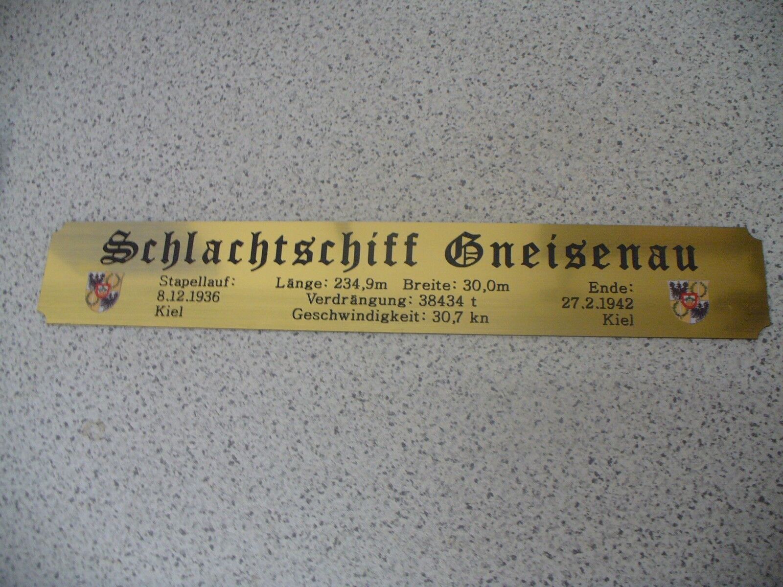 Sie bieten hier auf: 1 exclusives Namensschild mit Daten - Schlachtschiff Gneisenau - mit farbigem Schiffswappen und verschiedenen Daten (siehe Bild) goldfarbig mit schwarzem Schriftzug (auch in weiss - oder silberfarbig möglich --> dann bitte angeben) Abmessung: 275 x 43 x 1,5 mm Das Schild ist