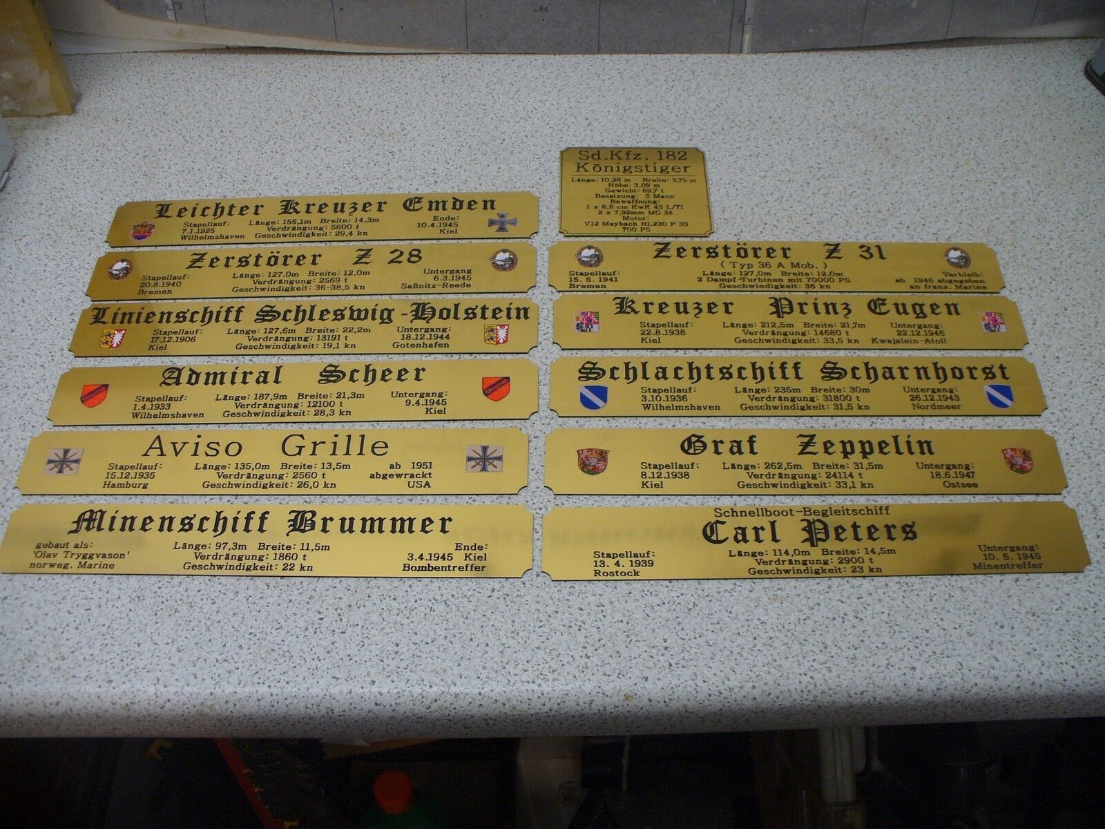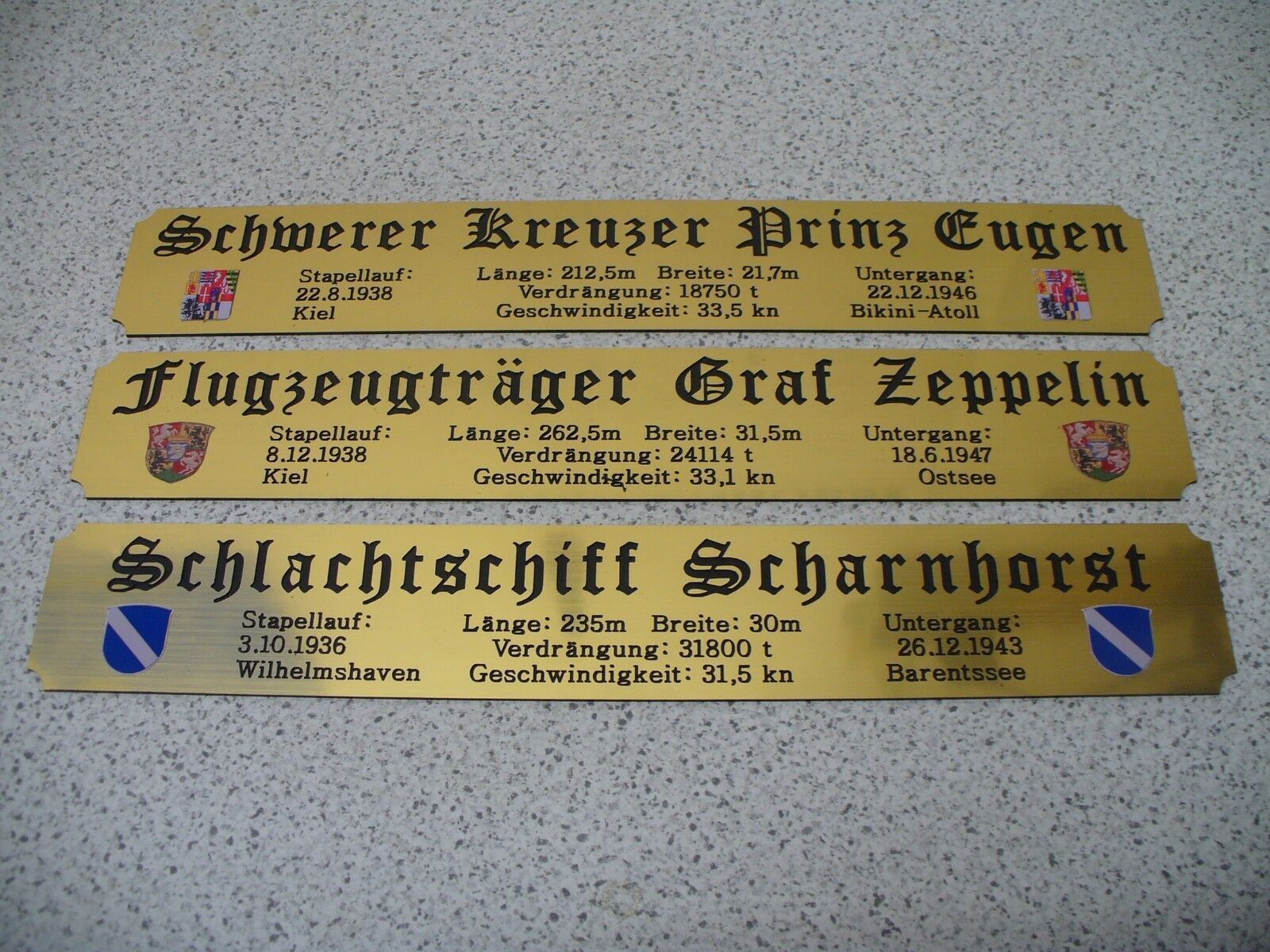 Sie bieten hier auf: 1 exclusives Namensschild mit Daten - Schlachtschiff H-Klasse - (sollten Sie lieber einen der möglichen, fiktiven Schiffsnamen wünschen, melden Sie sich gerne bei mir) mit farbigen Abzeichen und verschiedenen Daten (siehe Bild) goldfarbig mit schwarzem Schriftzug (auch in weiss