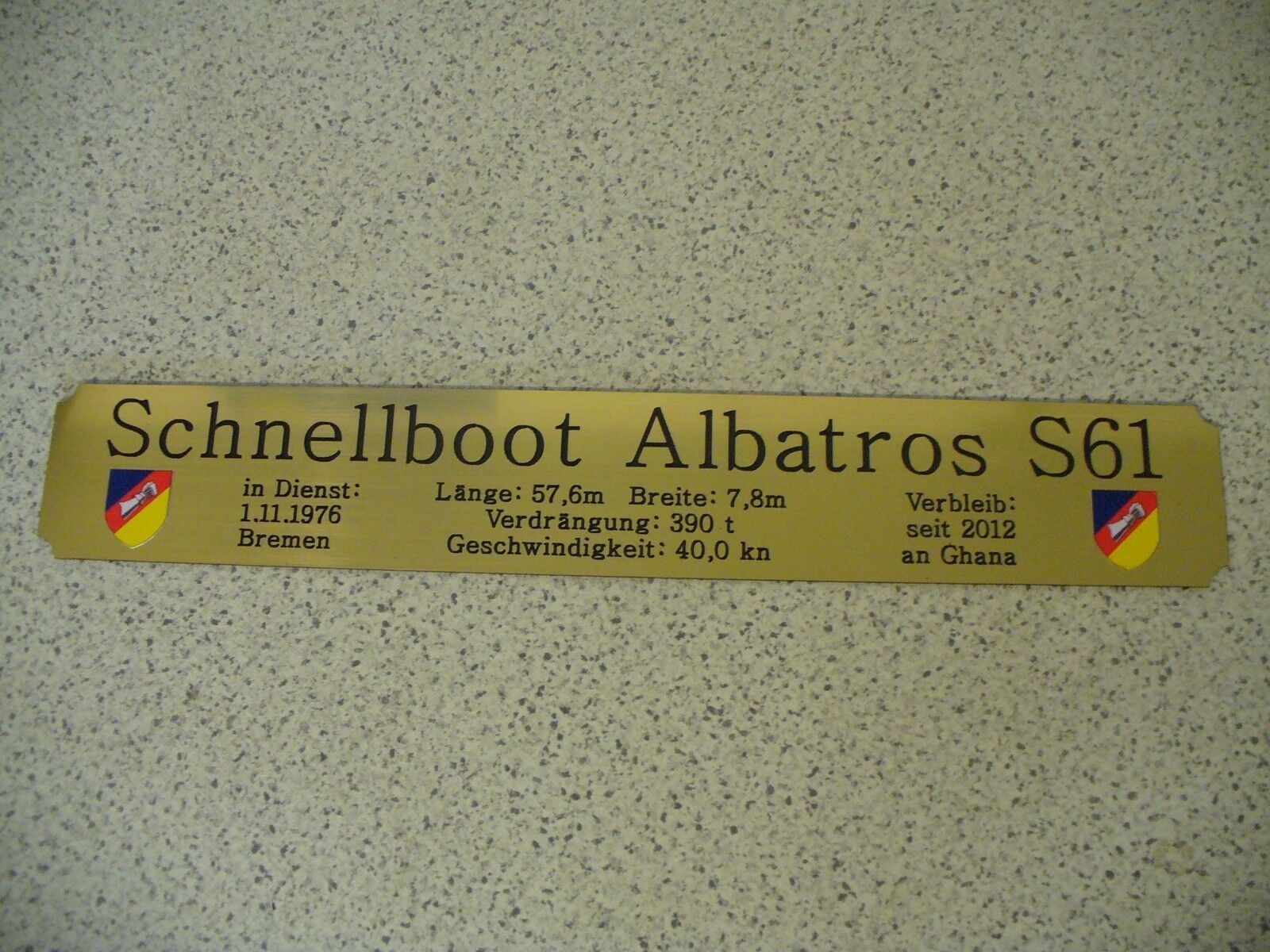 Sie bieten hier auf: 1 exclusives Namensschild mit Daten - Schnellboot Albatros S61 - mit farbigen Logos und verschiedenen Daten (siehe Bild) goldfarbig mit schwarzem Schriftzug (auch in weiss - oder silberfarbig möglich --> dann bitte angeben) Abmessung: 275 x 43 x 1,5 mm Das Schild ist von mir