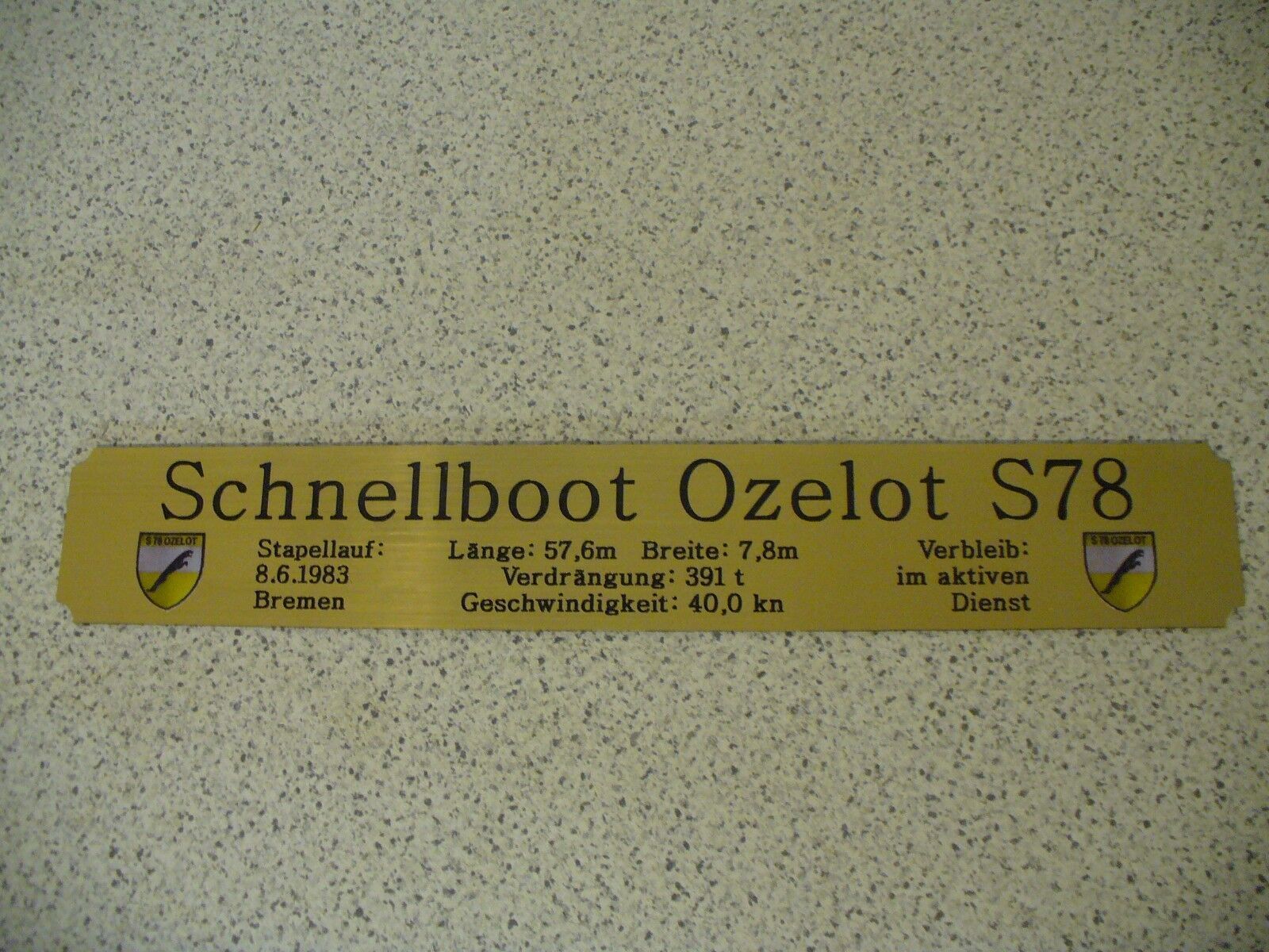 Sie bieten hier auf: 1 exclusives Namensschild mit Daten - Schnellboot Ozelot S78 - mit farbigen Logos und verschiedenen Daten (siehe Bild) goldfarbig mit schwarzem Schriftzug (auch in weiss - oder silberfarbig möglich --> dann bitte angeben) Abmessung: 275 x 43 x 1,5 mm Das Schild ist von mir mi