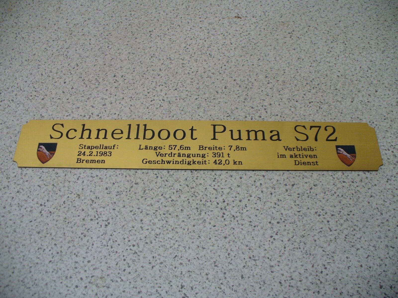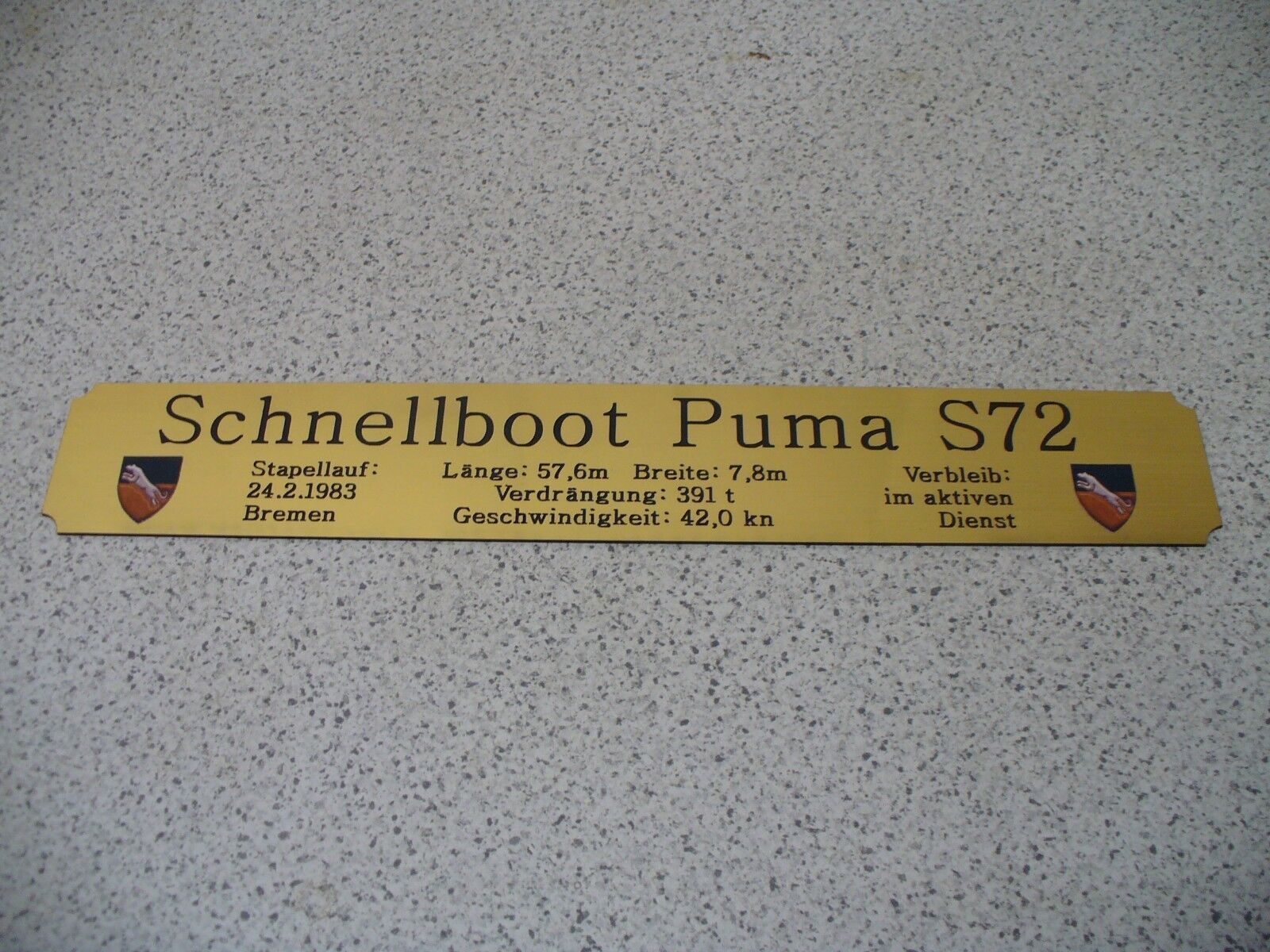 Sie bieten hier auf: 1 exclusives Namensschild mit Daten - Schnellboot Puma S72 - mit farbigen Logos und verschiedenen Daten (siehe Bild) goldfarbig mit schwarzem Schriftzug (auch in weiss - oder silberfarbig möglich --> dann bitte angeben) Abmessung: 275 x 43 x 1,5 mm Das Schild ist von mir mit