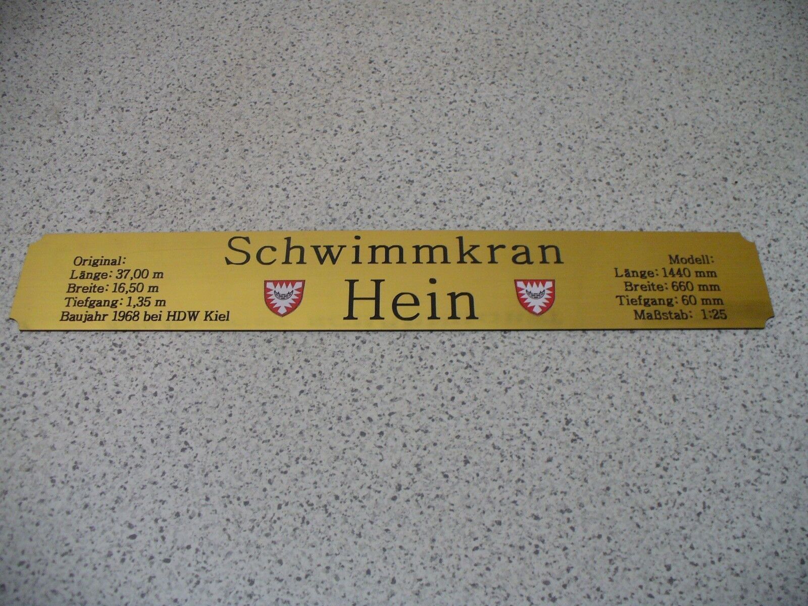 Sie bieten hier auf: 1 exclusives Namensschild mit Daten - Schwimmkran Hein - mit farbigen Logos und verschiedenen Daten (siehe Bild) goldfarbig mit schwarzem Schriftzug (auch in weiss - oder silberfarbig möglich --> dann bitte angeben) Abmessung: 275 x 43 x 1,5 mm Das Schild ist von mir mit eine