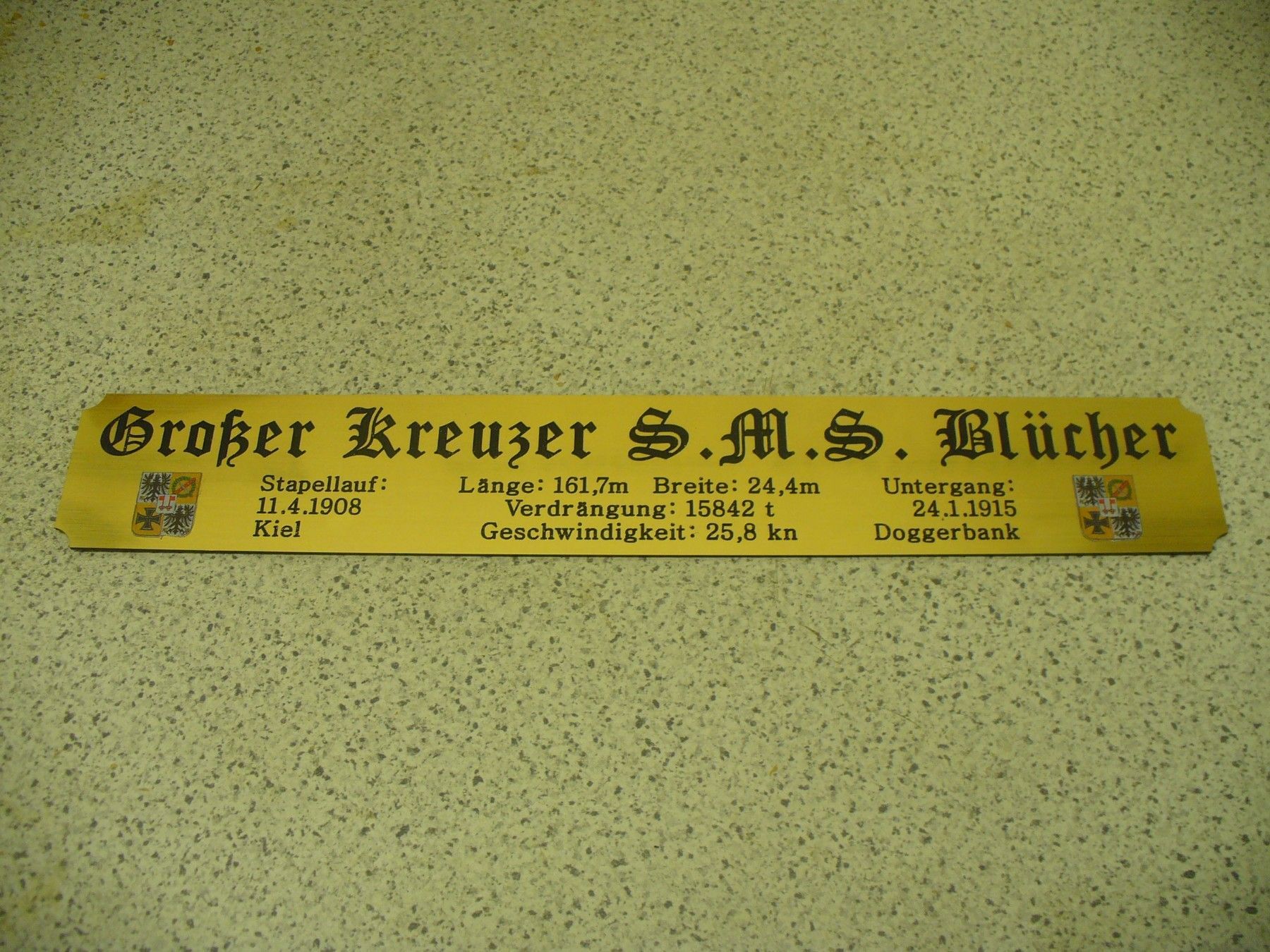 Sie bieten hier auf: 1 exclusives Namensschild mit Daten - Großer Kreuzer S.M.S Blücher - mit farbigen Wappen und verschiedenen Daten (siehe Bild) goldfarbig mit schwarzem Schriftzug (auch in weiss - oder silberfarbig möglich --> dann bitte angeben) Abmessung: 275 x 43 x 1,5 mm Das Schild ist von