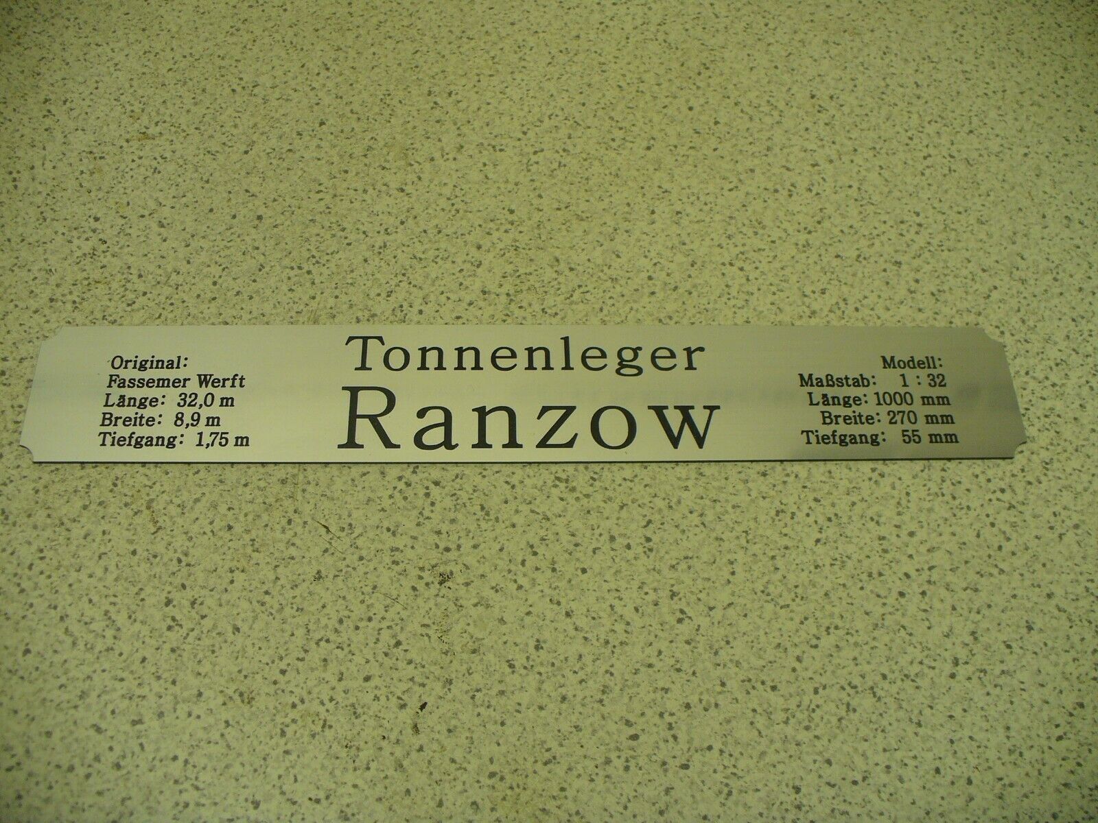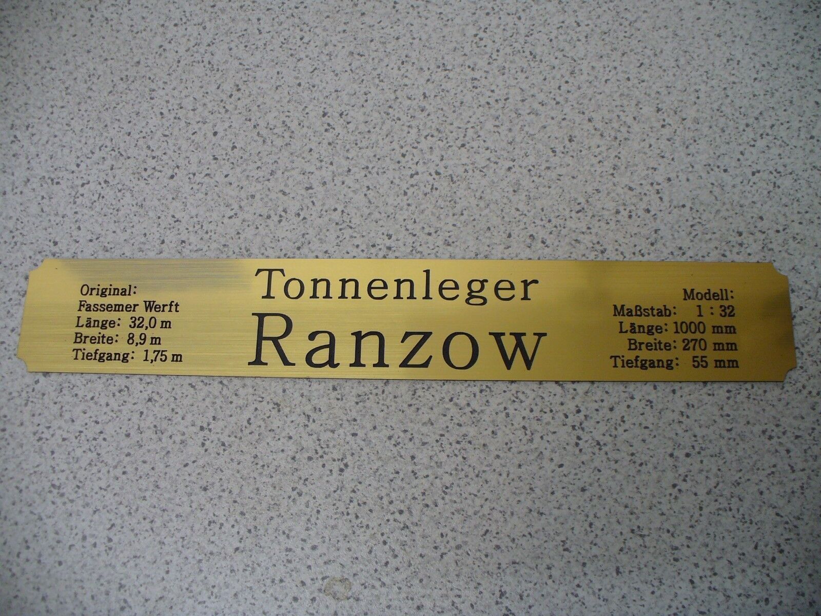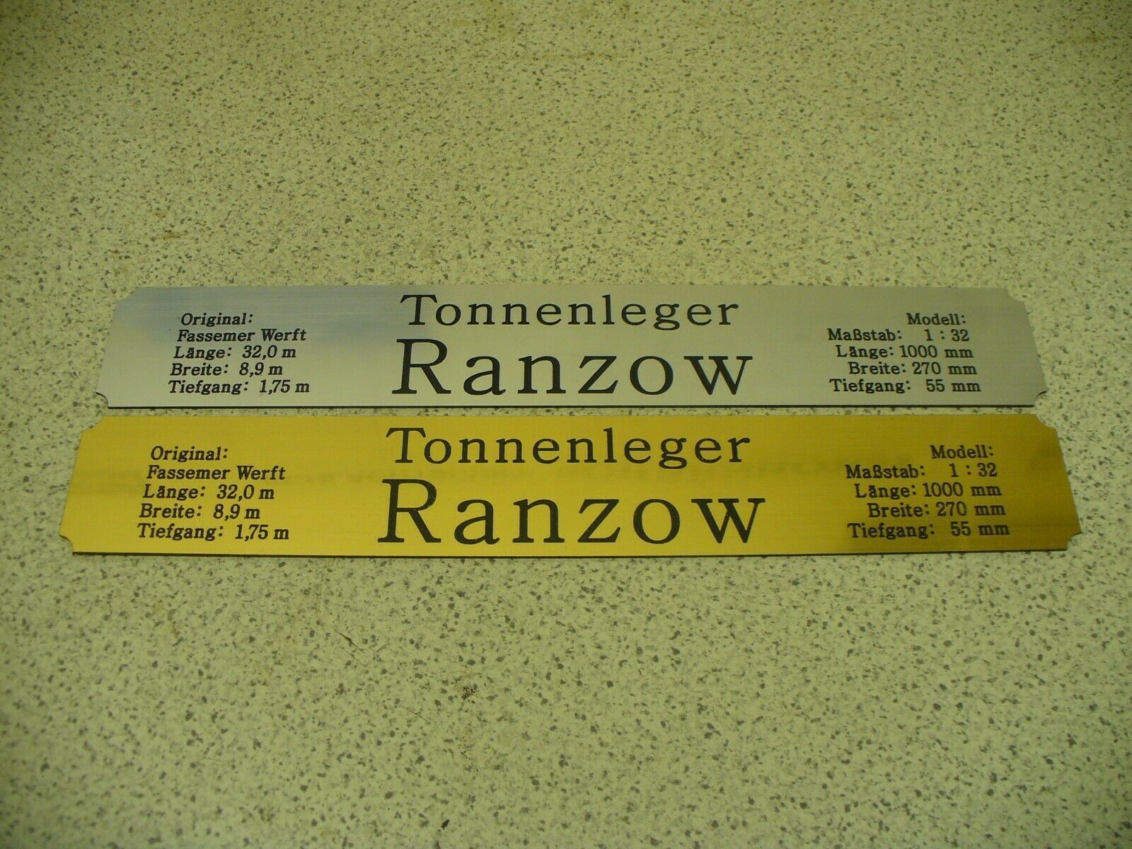 Sie bieten hier auf: 1 exclusives Namensschild mit Daten - Tonnenleger Repsold - mit verschiedenen Daten (siehe Bild) goldfarbig mit schwarzem Schriftzug (auch in weiss - oder silberfarbig möglich --> dann bitte angeben) Abmessung: 275 x 43 x 1,5 mm Das Schild ist von mir mit einer CNC-Fräse aus