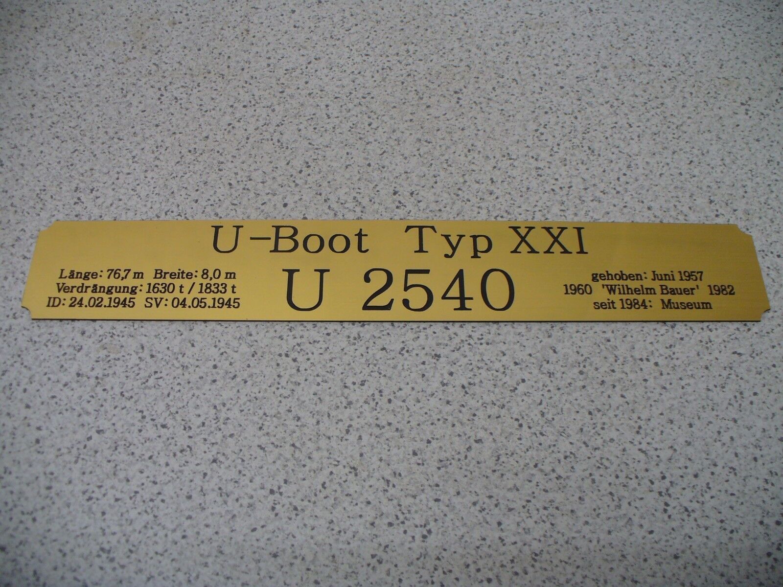 Sie bieten hier auf: 1 exclusives Namensschild mit Daten - U 2540 - mit verschiedenen Daten (siehe Bild) goldfarbig mit schwarzem Schriftzug (auch in weiss - oder silberfarbig möglich --> dann bitte angeben) Abmessung: 275 x 43 x 1,5 mm Das Schild ist von mir mit einer CNC-Fräse aus 1,5mm dickem,