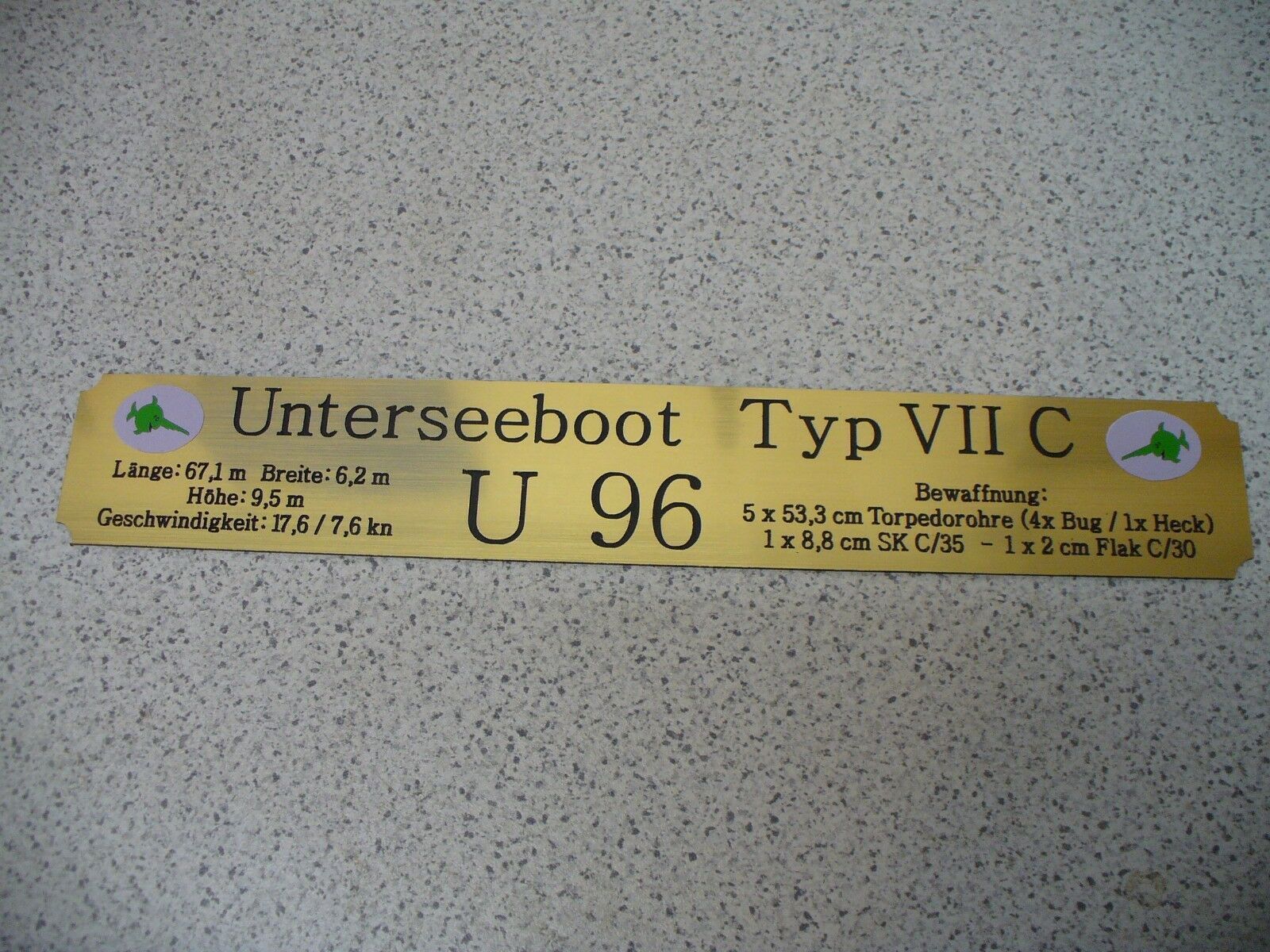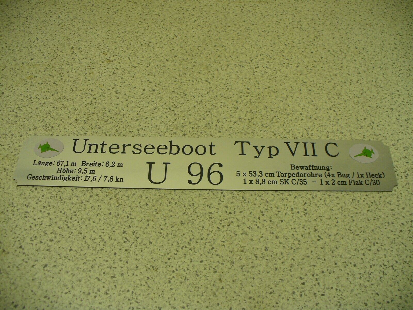 Sie bieten hier auf: 1 exclusives Namensschild mit Daten - U 96 - mit farbigen Logos und verschiedenen Daten (siehe Bild) goldfarbig mit schwarzem Schriftzug (auch in weiss - oder silberfarbig möglich --> dann bitte angeben) Abmessung: 275 x 43 x 1,5 mm Das Schild ist von mir mit einer CNC-Fräse