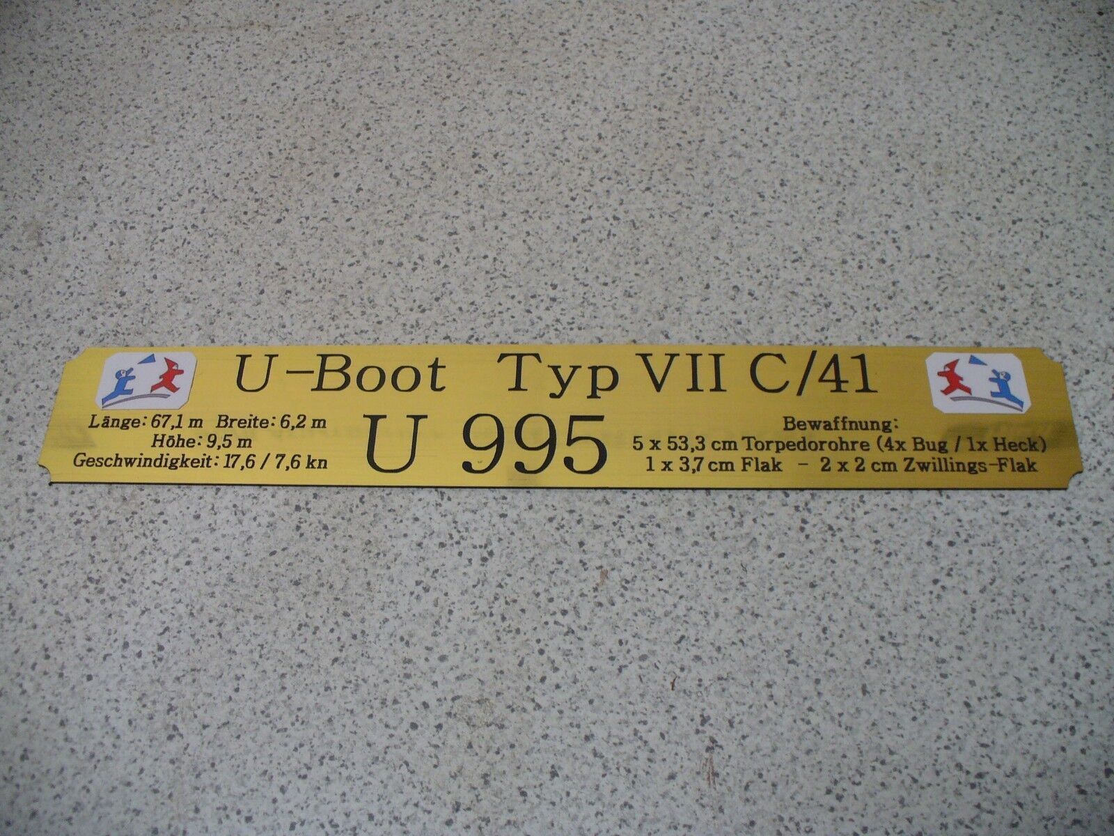 Sie bieten hier auf: 1 exclusives Namensschild mit Daten - U 995 - mit farbigen Logos und verschiedenen Daten (siehe Bild) goldfarbig mit schwarzem Schriftzug (auch in weiss - oder silberfarbig möglich --> dann bitte angeben) Abmessung: 275 x 43 x 1,5 mm Das Schild ist von mir mit einer CNC-Fräse