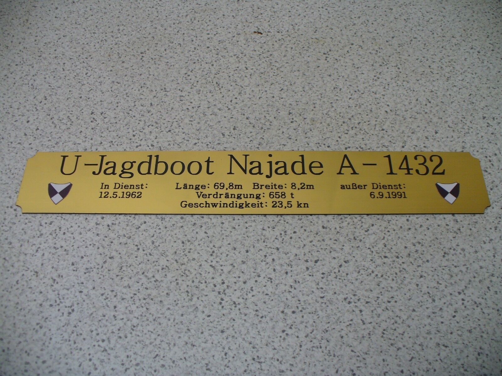 Sie bieten hier auf: 1 exclusives Namensschild mit Daten - U-Jagdboot Najade A1432 - mit farbigen Logos und verschiedenen Daten (siehe Bild) goldfarbig mit schwarzem Schriftzug (auch in weiss - oder silberfarbig möglich --> dann bitte angeben) Abmessung: 275 x 43 x 1,5 mm Das Schild ist von mir m