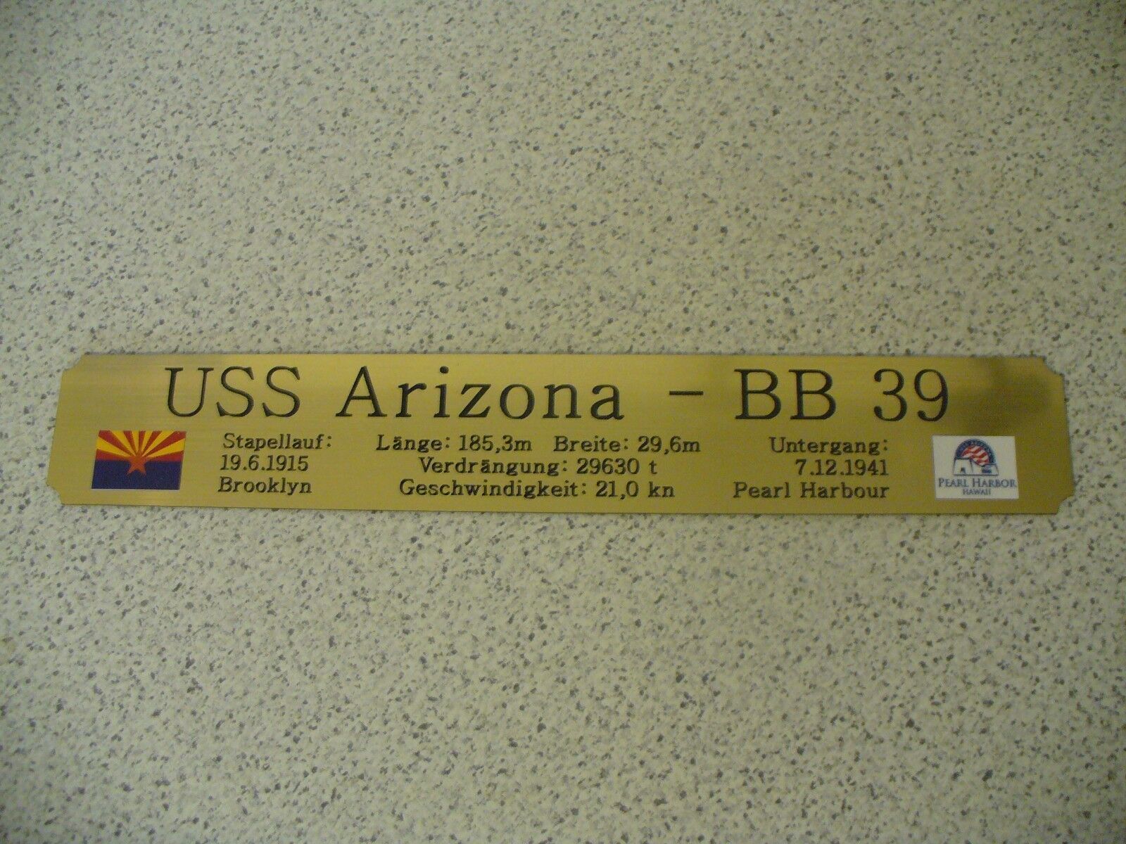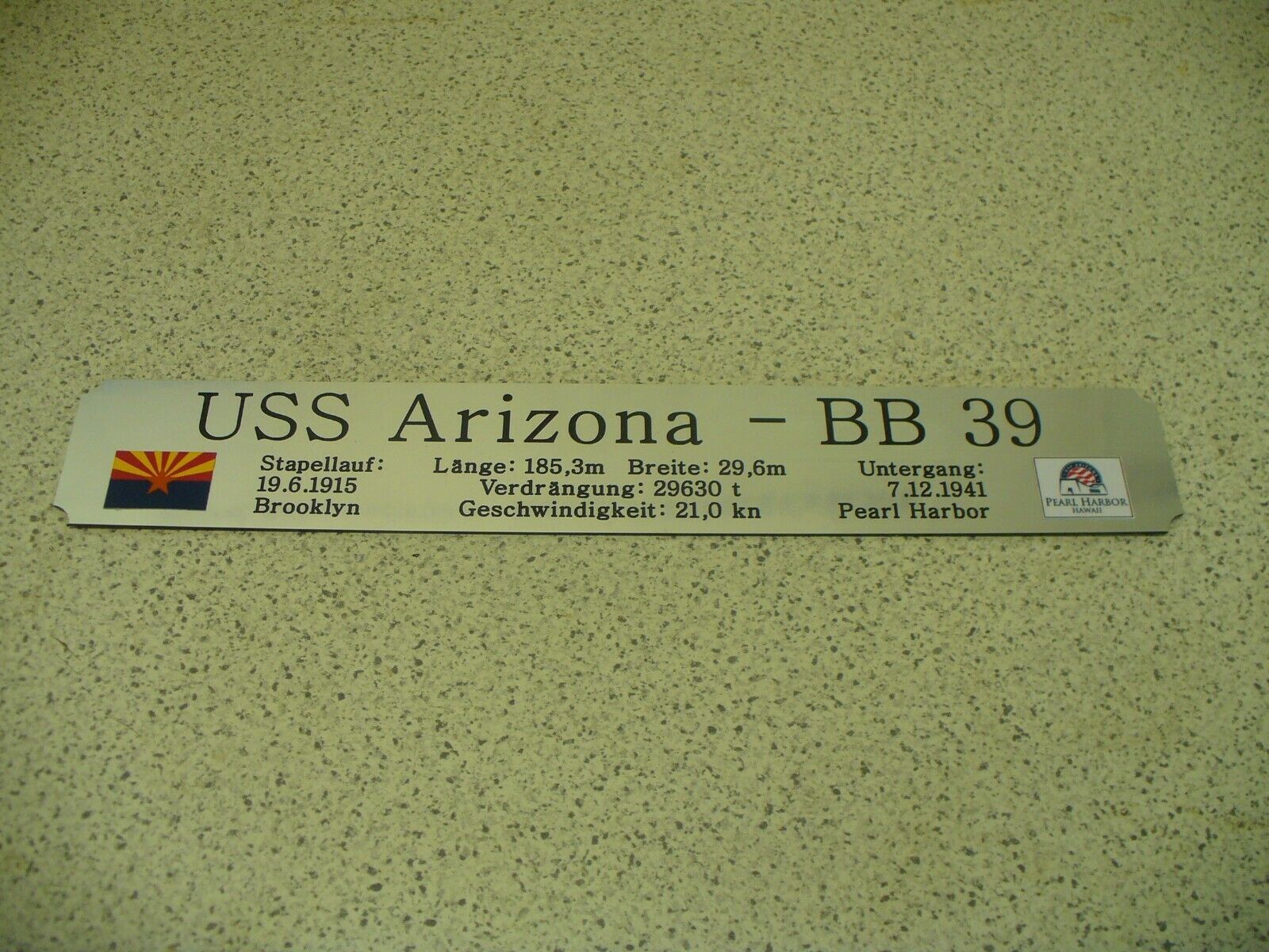 Sie bieten hier auf: 1 exclusives Namensschild mit Daten - USS Arizona BB39 - mit farbigen Logos und verschiedenen Daten (siehe Bild) goldfarbig mit schwarzem Schriftzug (auch in weiss - oder silberfarbig möglich --> dann bitte angeben) Abmessung: 275 x 43 x 1,5 mm Das Schild ist von mir mit eine