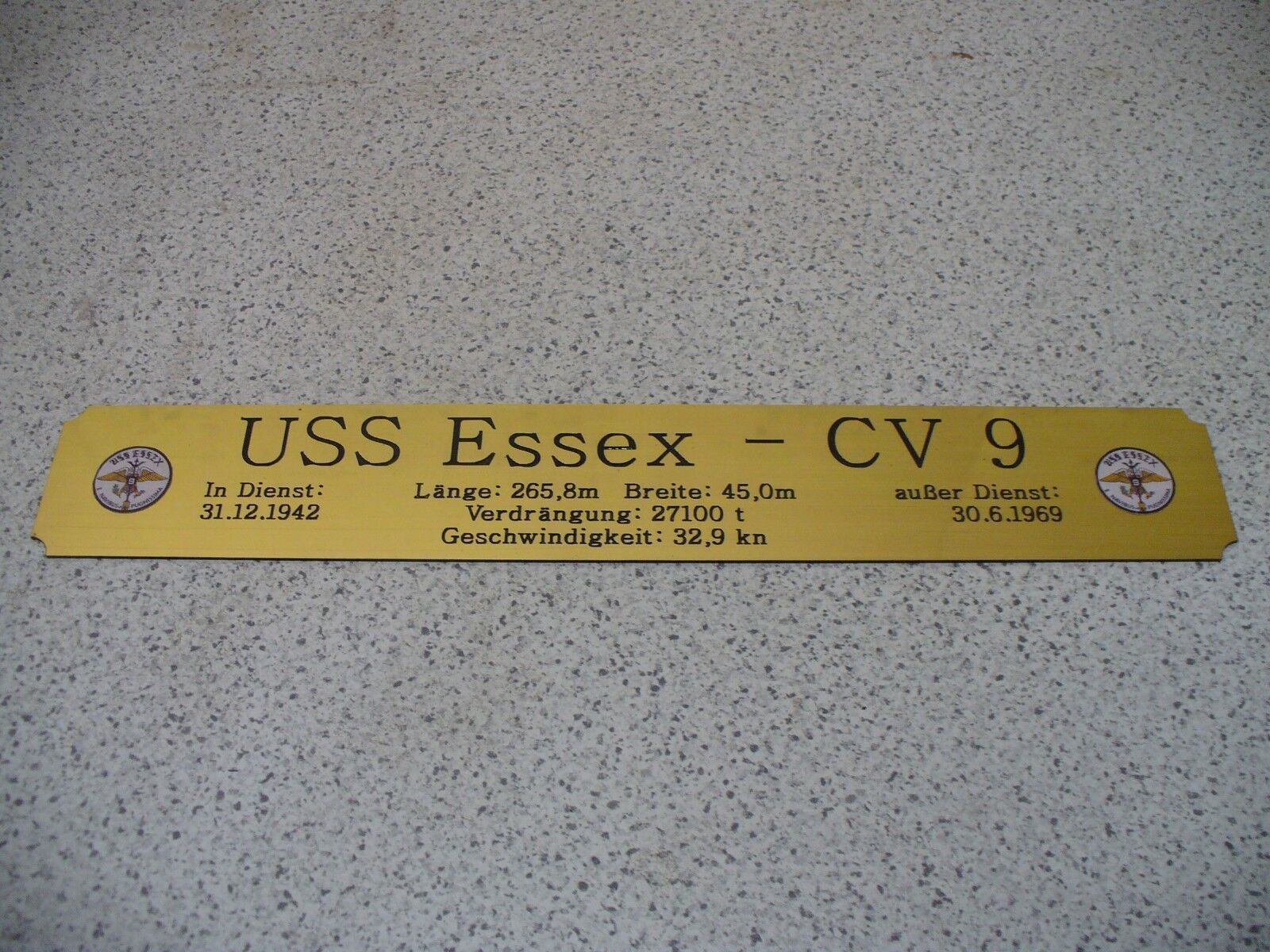 Sie bieten hier auf: 1 exclusives Namensschild mit Daten - USS Essex CV9 - mit farbigen Logos und verschiedenen Daten (siehe Bild) goldfarbig mit schwarzem Schriftzug (auch in weiss - oder silberfarbig möglich --> dann bitte angeben) Abmessung: 275 x 43 x 1,5 mm Das Schild ist von mir mit einer C