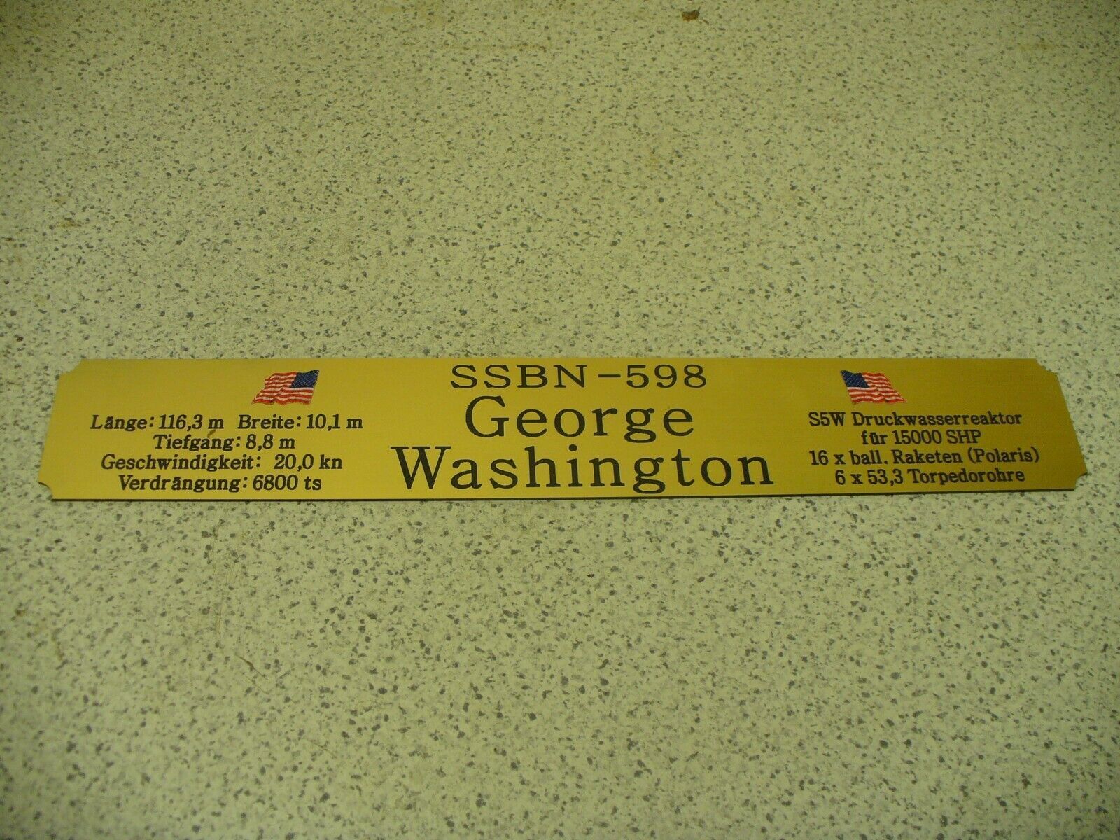 Sie bieten hier auf: 1 exclusives Namensschild mit Daten - USS George Washington SSBN-598 - mit verschiedenen Daten und farbigen Flaggen (siehe Bild) goldfarbig mit schwarzem Schriftzug (auch in weiss - oder silberfarbig möglich --> dann bitte angeben) Abmessung: 275 x 43 x 1,5 mm Das Schild ist