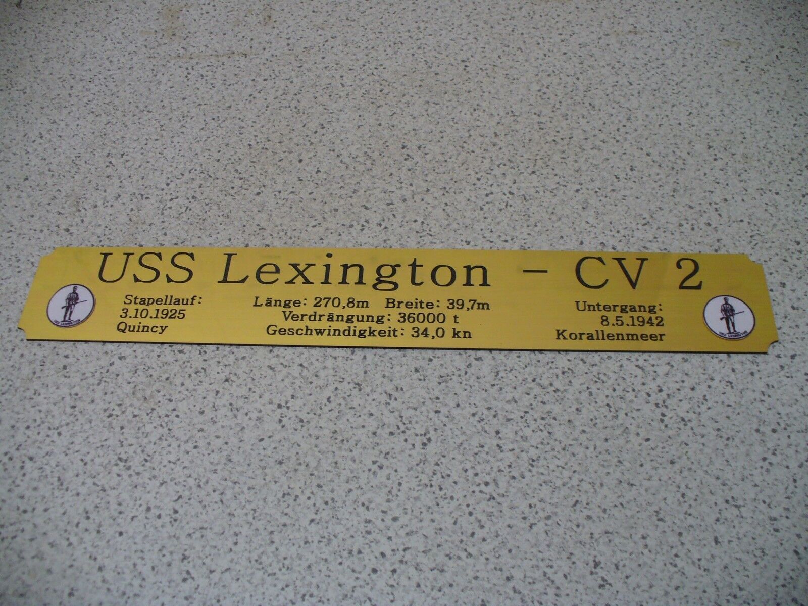 Sie bieten hier auf: 1 exclusives Namensschild mit Daten - USS Lexington CV2 - mit farbigen Logos und verschiedenen Daten (siehe Bild) goldfarbig mit schwarzem Schriftzug (auch in weiss - oder silberfarbig möglich --> dann bitte angeben) Abmessung: 275 x 43 x 1,5 mm Das Schild ist von mir mit ein