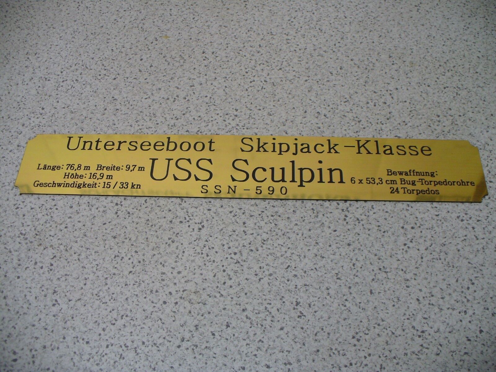 Sie bieten hier auf: 1 exclusives Namensschild mit Daten - USS Sculpin - mit verschiedenen Daten (siehe Bild) goldfarbig mit schwarzem Schriftzug (auch in weiss - oder silberfarbig möglich --> dann bitte angeben) Abmessung: 275 x 43 x 1,5 mm Das Schild ist von mir mit einer CNC-Fräse aus 1,5mm di