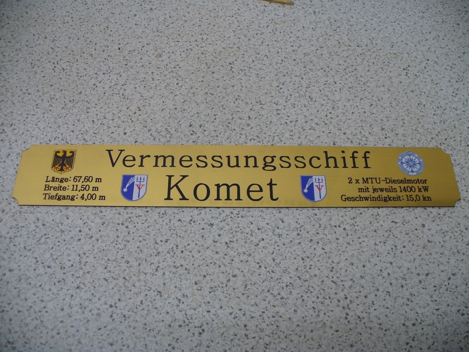Sie bieten hier auf: 1 exclusives Namensschild mit Daten - Vermessungsschiff Komet - mit farbigen Logos und verschiedenen Daten (siehe Bild) goldfarbig mit schwarzem Schriftzug (auch in weiss - oder silberfarbig möglich --> dann bitte angeben) Abmessung: 275 x 43 x 1,5 mm Das Schild ist von mir m
