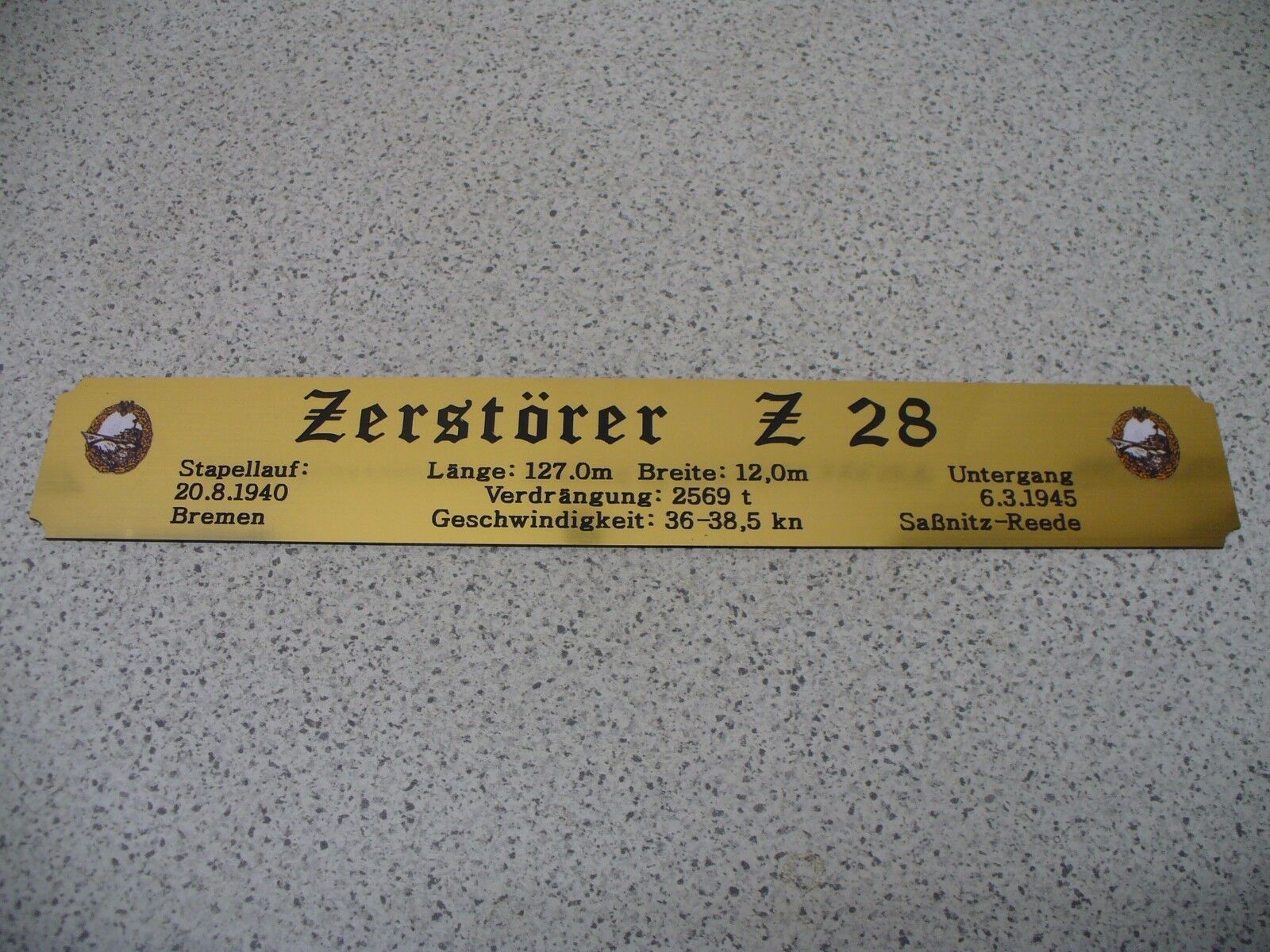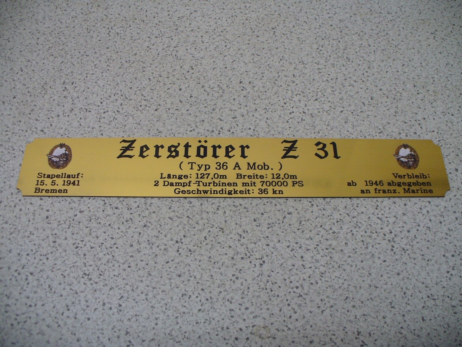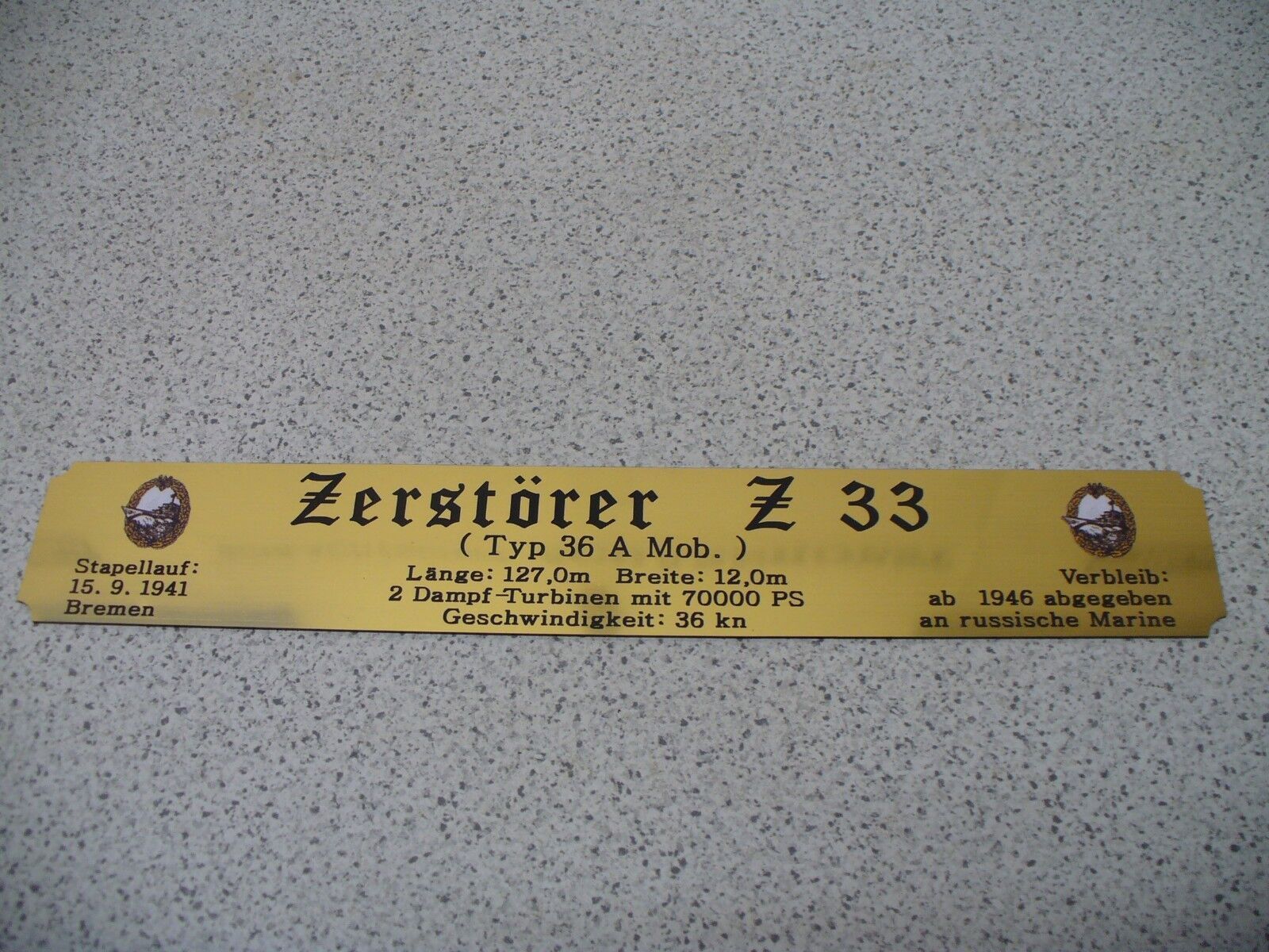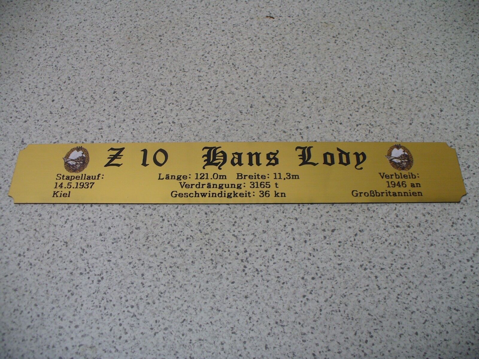 Sie bieten hier auf: 1 exclusives Namensschild mit Daten - Zerstörer Z9 - (oder Z10; Z11; Z16; Z28; Z31; Z32; Z33 andere gerne auf Anfrage) mit farbigen Logos und verschiedenen Daten (siehe Bild) goldfarbig mit schwarzem Schriftzug (auch in weiss - oder silberfarbig möglich --> dann bitte angeben