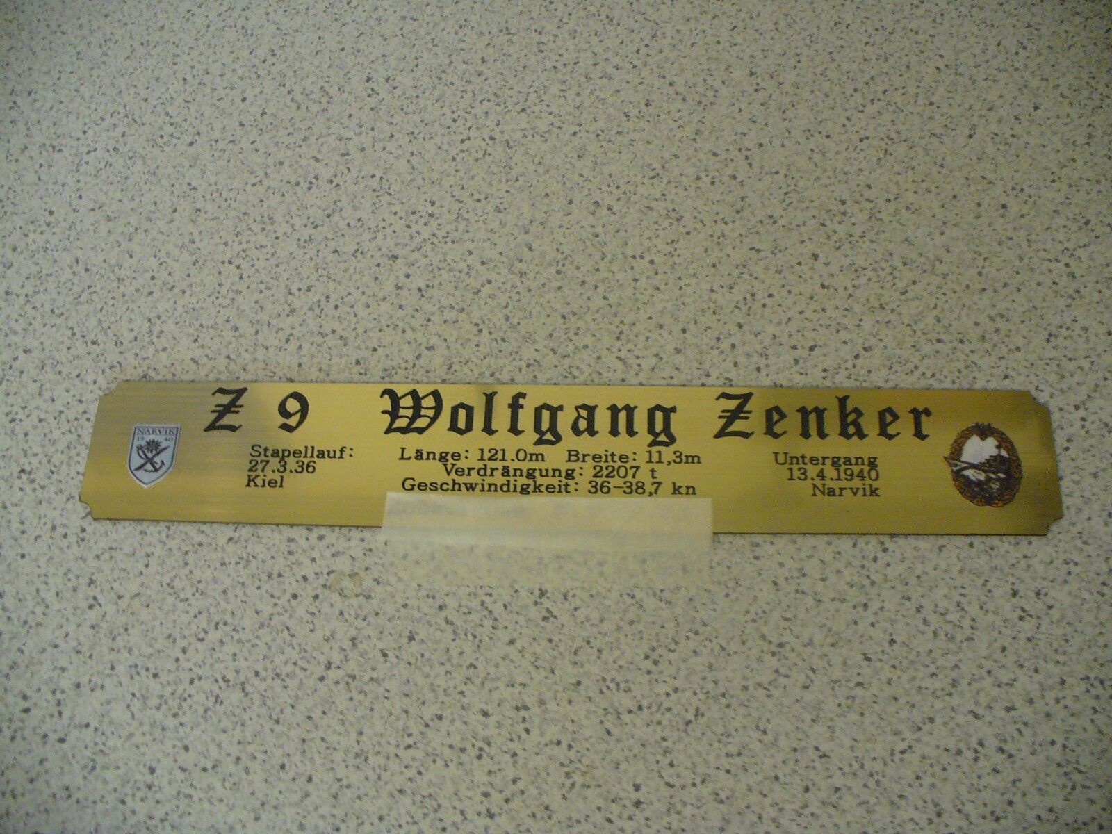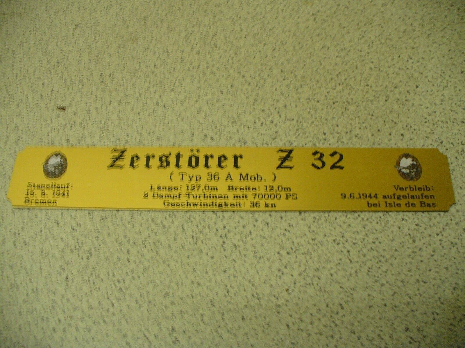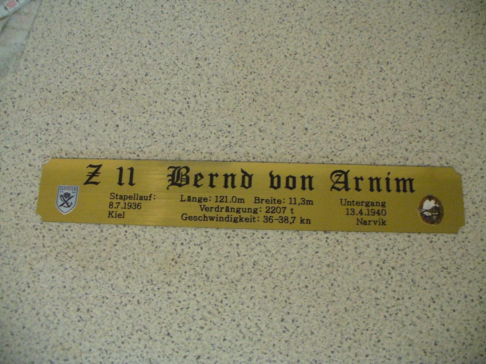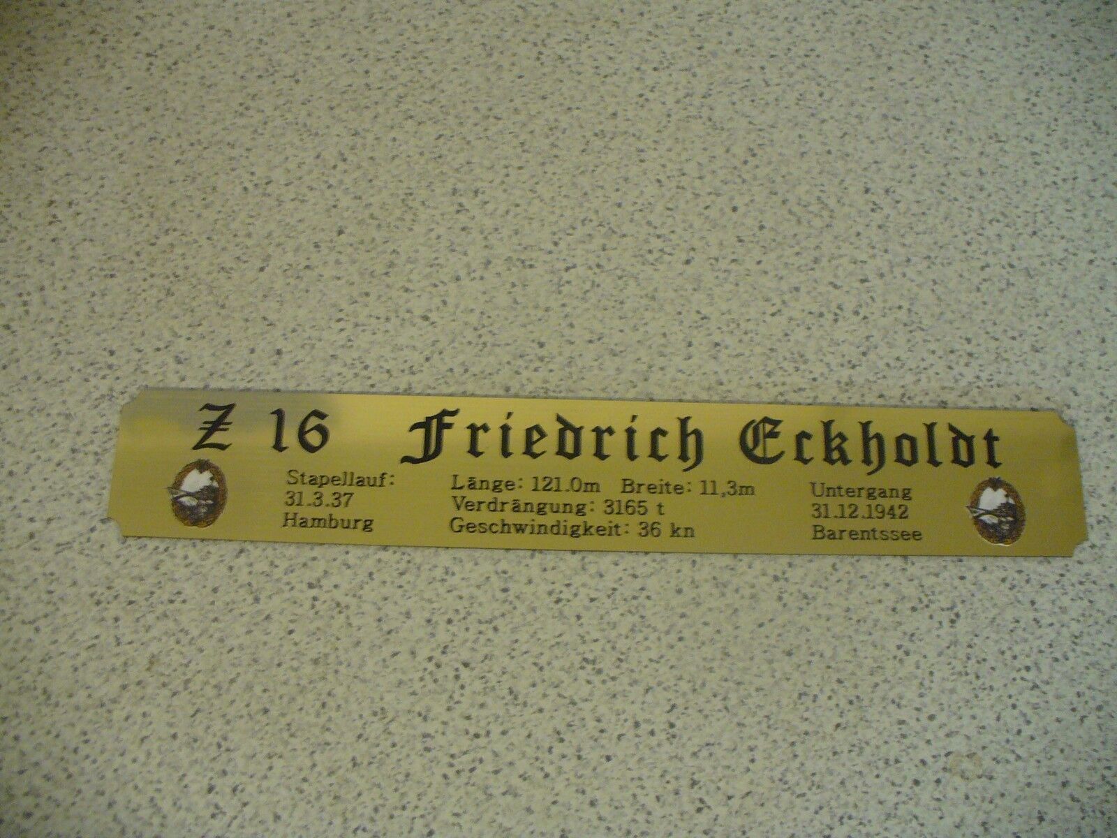Sie bieten hier auf: 1 exclusives Namensschild mit Daten - Zerstörer Z9 - (oder Z10; Z11; Z16; Z28; Z31; Z32; Z33 andere gerne auf Anfrage) mit farbigen Logos und verschiedenen Daten (siehe Bild) goldfarbig mit schwarzem Schriftzug (auch in weiss - oder silberfarbig möglich --> dann bitte angeben