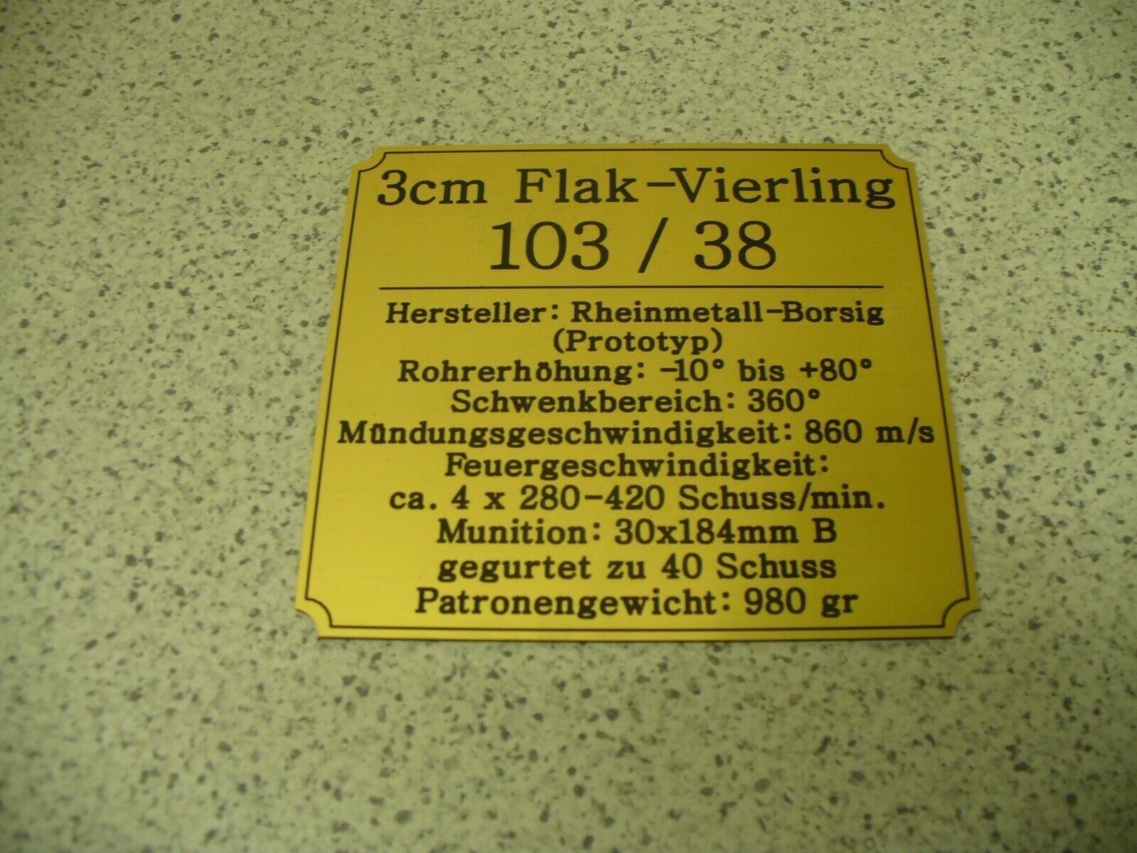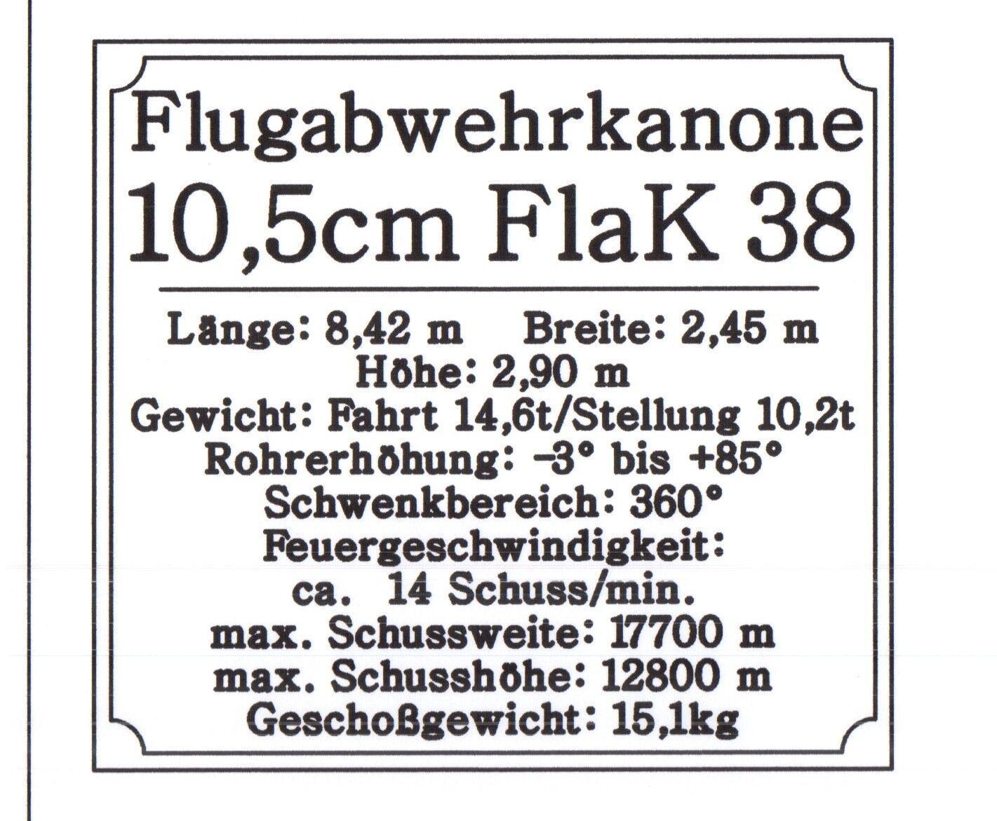 Sie bieten hier auf: 1 Namensschild - 3 cm FlaK 103 38 Vierling - mit verschiedenen Daten (siehe Bild) goldfarbig mit schwarzem Schriftzug (auch in weiss - oder silberfarbig möglich --> dann bitte angeben) Abmessung: 94 x 87 x 1,5 mm Das Schild ist von mir mit einer CNC-Fräse aus 1,5mm dickem, 2-