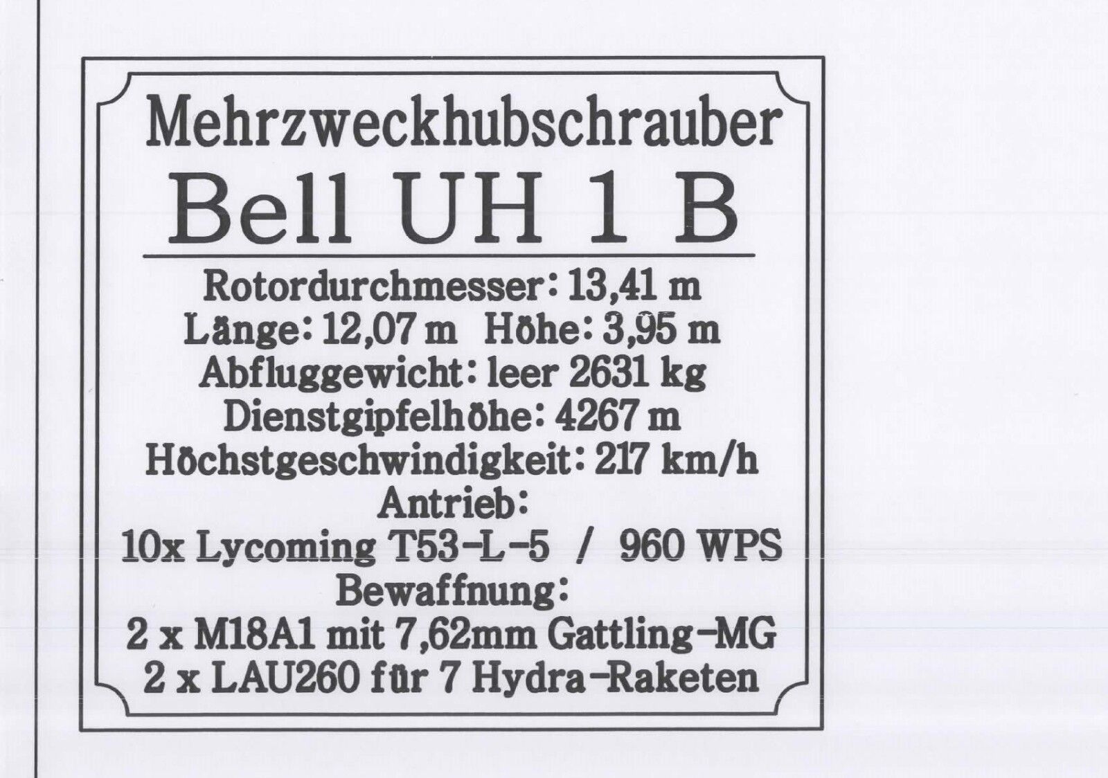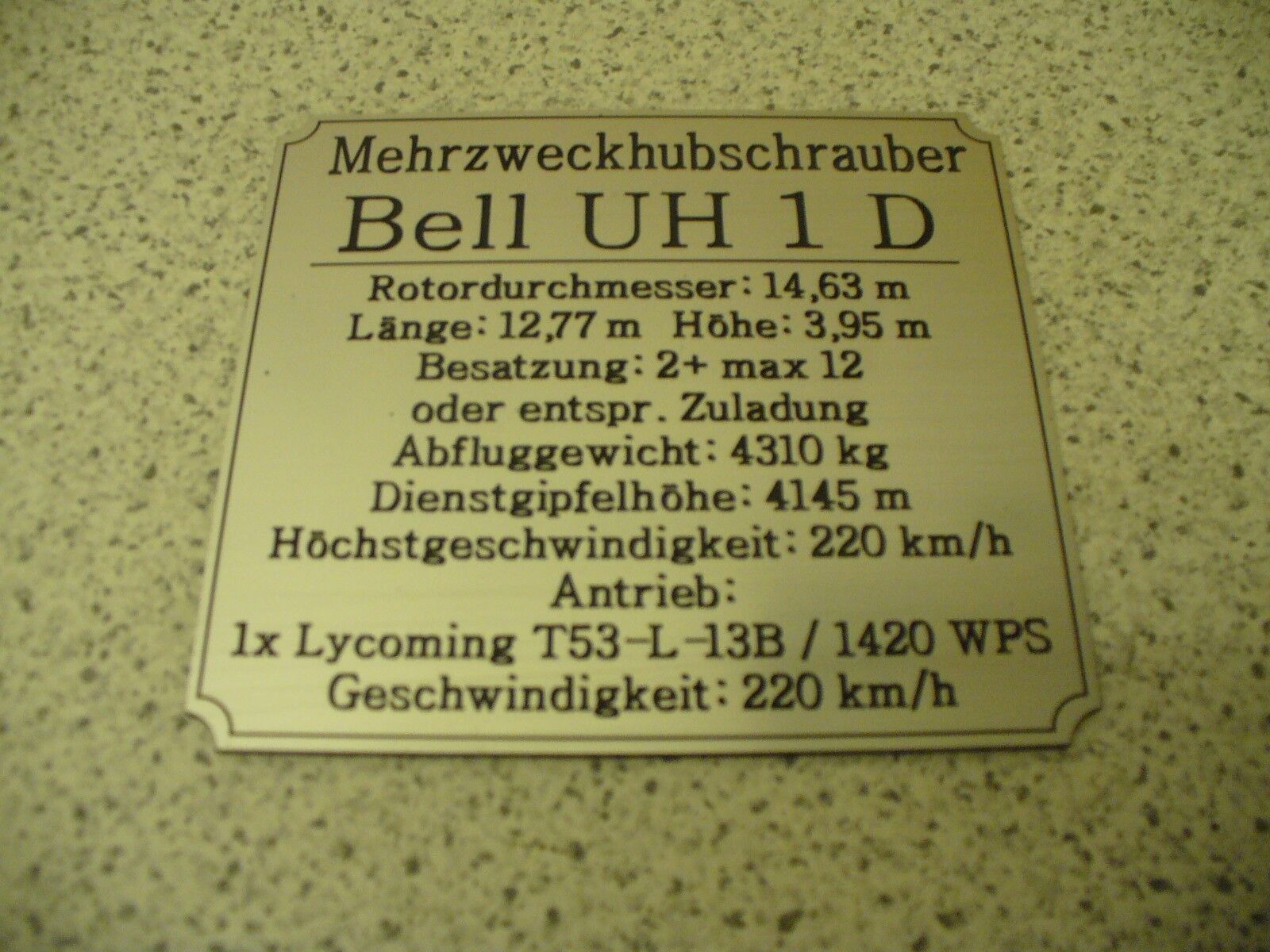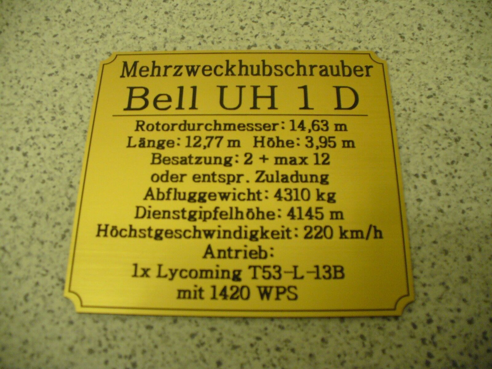 Sie bieten hier auf: 1 Namensschild - Bell UH 1 D - (oder UH 1 B - dann bitte angeben) mit verschiedenen Daten (siehe Bild) goldfarbig mit schwarzem Schriftzug (auch in weiss - oder silberfarbig möglich --> dann bitte angeben) Abmessung: 94 x 87 x 1,5 mm Das Schild ist von mir mit einer CNC-Fräse