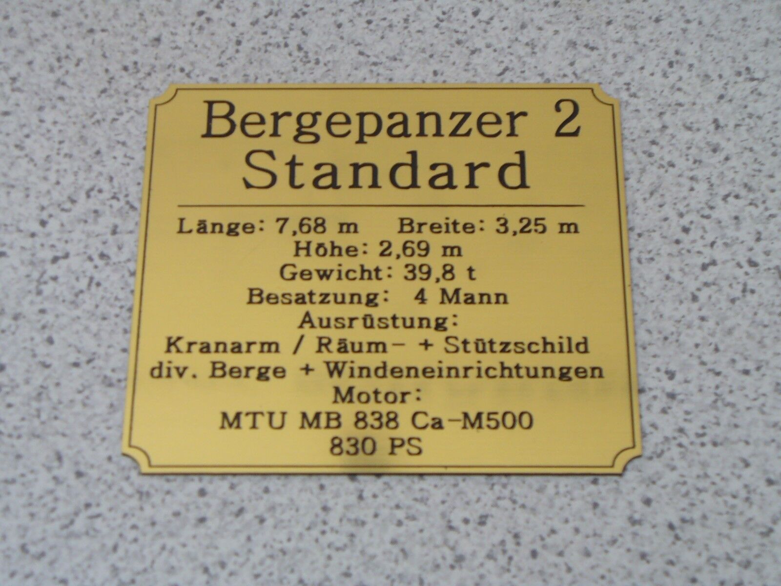 Sie bieten hier auf: 1 Namensschild - Bergepanzer 2 - mit verschiedenen Daten (siehe Bild) goldfarbig mit schwarzem Schriftzug (auch in weiss - oder silberfarbig möglich --> dann bitte angeben) Abmessung: 94 x 87 x 1,5 mm Das Schild ist von mir mit einer CNC-Fräse aus 1,5mm dickem, 2-farbigem Gra